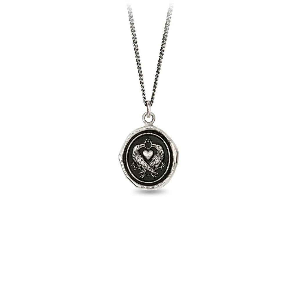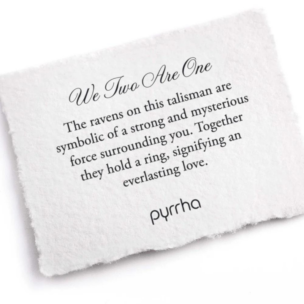 Cast using authentic wax seals and imagery from the Victorian Era, Pyrrha talismans are designed to inspire the wearer with its heralded meaning. The ravens on this talisman are symbolic of a strong and mysterious force surrounding you. Together they hold a ring, signifying an everlasting love. Made of 100% recycled sterling silver, the pendant measures 0.87" x 0.78". The oxidized silver fine curb chain is 18". Comes with a meaning card. Handcrafted in Vancouver, Canada.