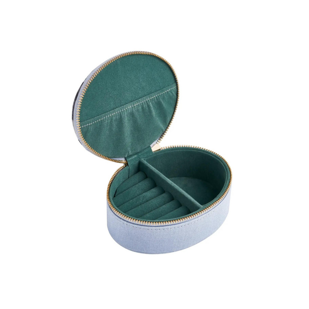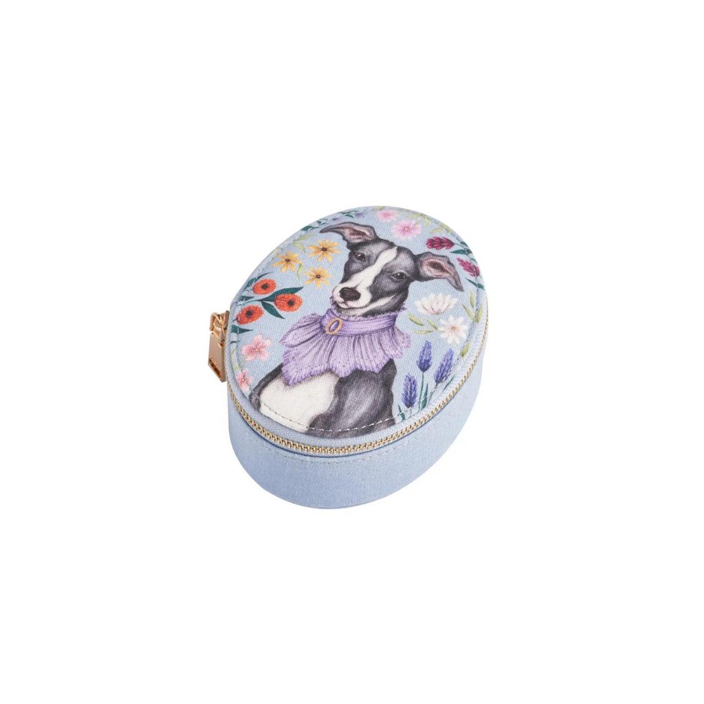 Organize and protect your treasured jewelry pieces in this small jewelry box by Fable England! The cotton exterior features Catherine Rowe's "Pet Portraits" Whippet print, and the green polyester flocked interior features multiple pockets and compartments to keep your jewelry safe and secure. Measures approx. 4.75" x 3.75" x 2". Wipe clean with a damp cloth. Designed in England.