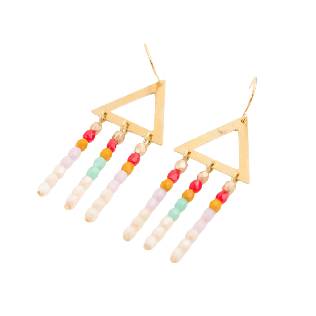 Add a pop of color and joy to your daily jewelry ensemble with these triangle chandelier earrings by Nest Pretty Things. These earrings measure 2" long and are made with 3mm czech glass beads, brass, and 24k gold plated earwires. Handcrafted in US.