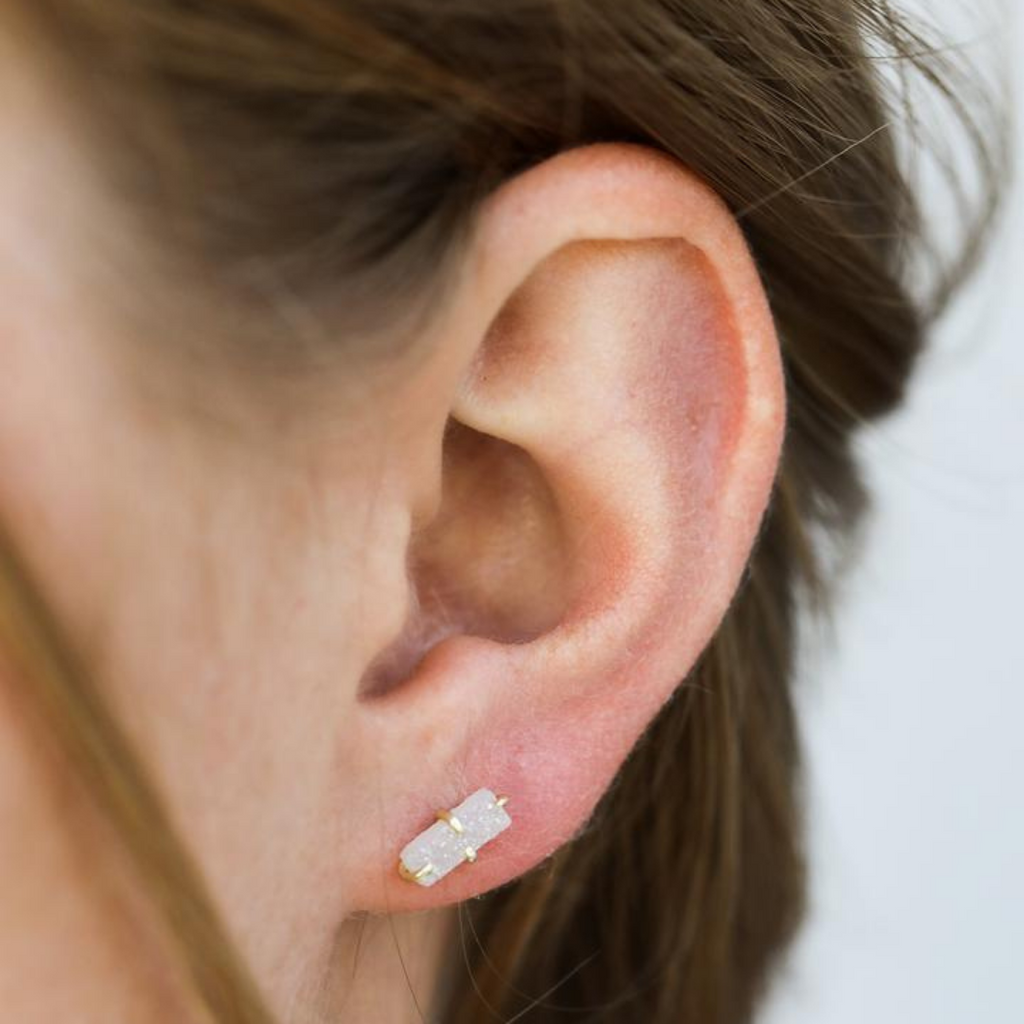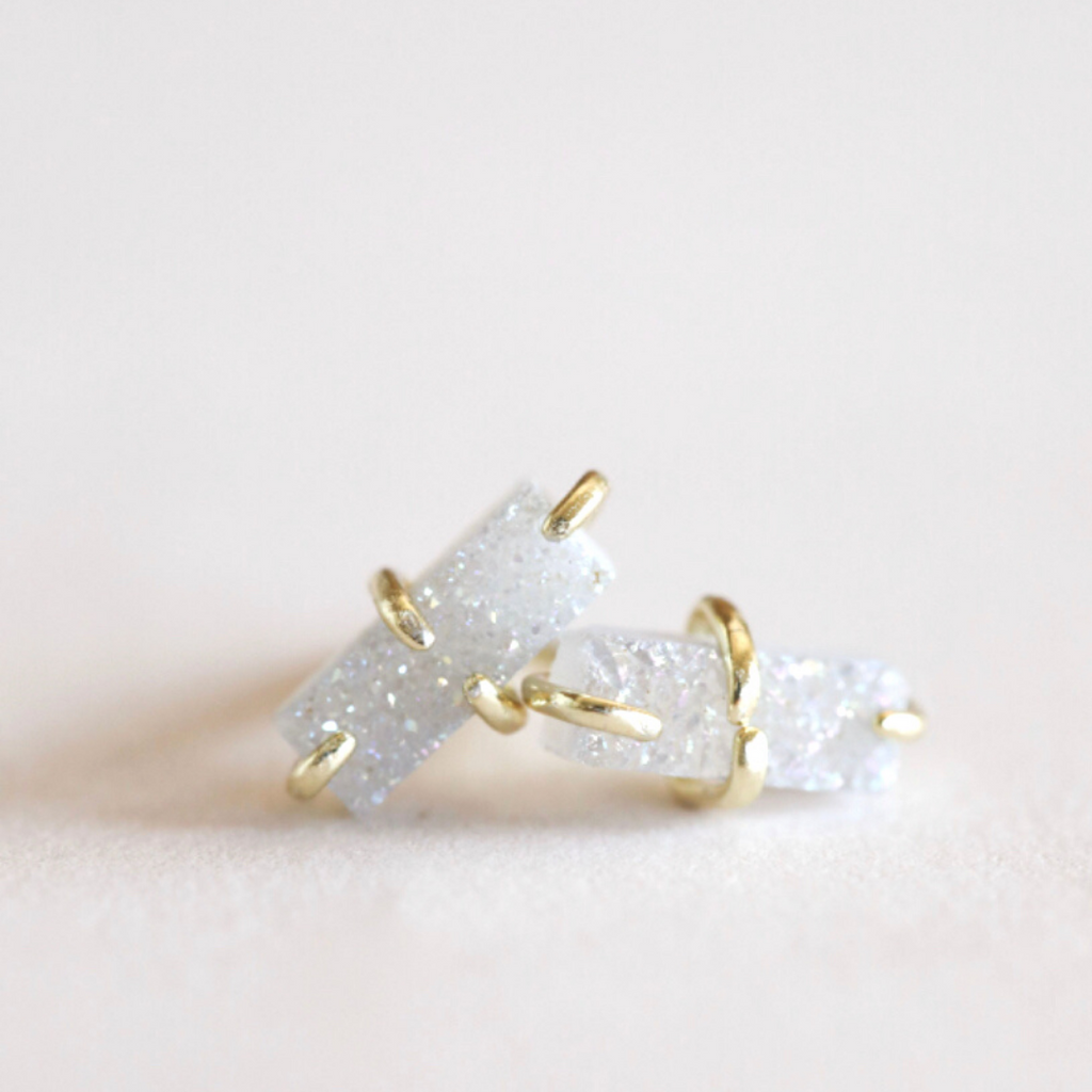 Natural white druzy stones are set into a simple four-prong 18k yellow gold plated setting over sterling silver by JaxKelly. Measures approximately 1/4". Each stone is unique and varies slightly in color and size. Handmade in US.