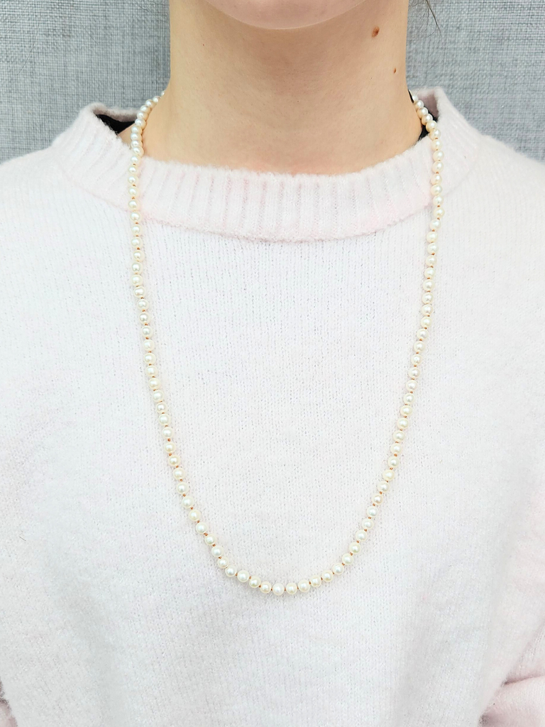 Wear this Lena Skadegard necklace by itself for a simple, elegant look, layered up with other necklaces, or wrapped as a bracelet for a bohemian look! White freshwater pearls are hand knotted on a brown poly blend cord, with a 9k yellow gold hook clasp. Measures 28" long.