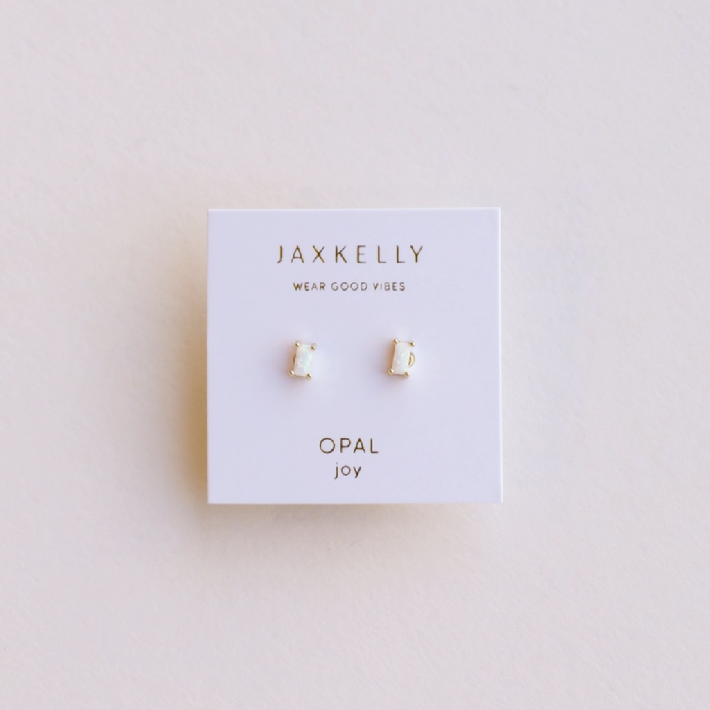 These delicate classic baguette studs by JaxKelly are just what you need to add a little color to your ears. Perfect for everyday, these white opal baguettes are set in a four prong setting of 18ky gold plate over sterling silver. Stones measure approximately 0.11" long. Handcrafted in US.