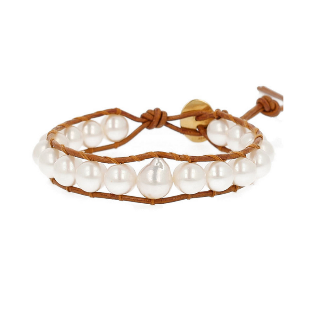 This leather bracelet by Chan Luu will add a bohemian flair to any outfit! Made of brown henna leather, a white baroque pearl, and freshwater pearls with an 18k yellow gold plated sterling silver oval button closure. Adjustable at 6/7/8 inches. Handmade in Vietnam.