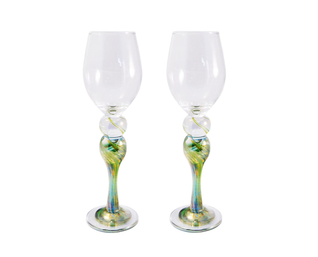 Add elegance to any table or gathering with these handblown wine glasses by Rosetree! The iridescent, marbleized stem makes this glassware a beautiful choice for everyday or special occasions. Makes a wonderful wedding gift. Sold by the pair. Measures approx. 10 inches tall. Handcrafted in US.