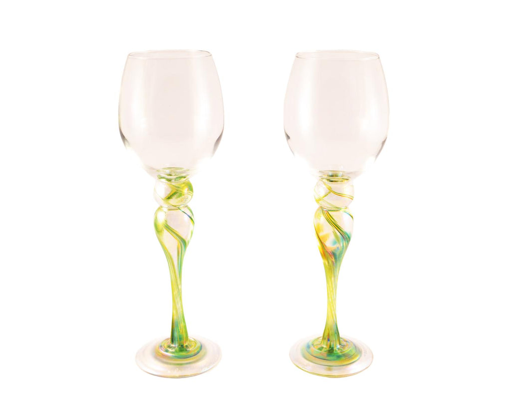 Add elegance to any table or gathering with these handblown wine glasses by Rosetree! The iridescent, marbleized stem makes this glassware a beautiful choice for everyday or special occasions. Makes a wonderful wedding gift. Sold by the pair. Measures approx. 10” tall. Handcrafted in US.