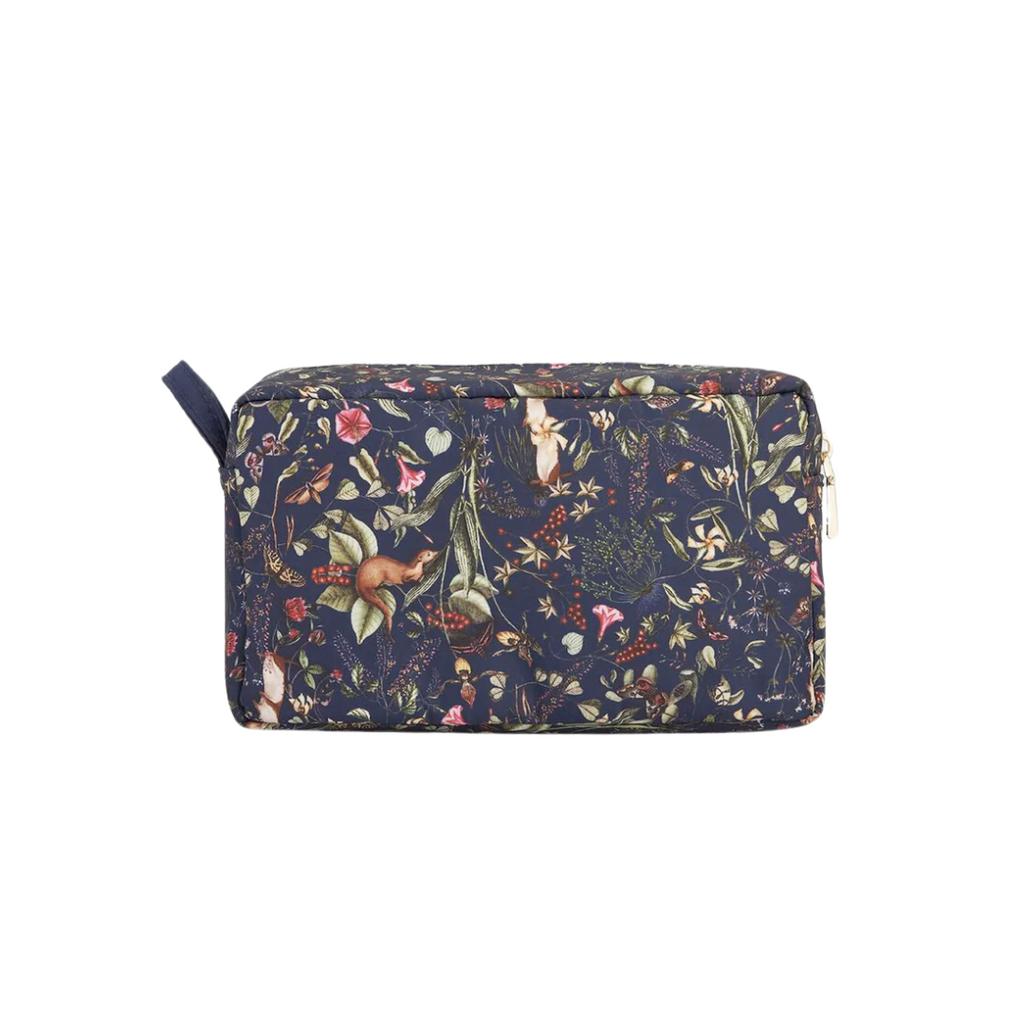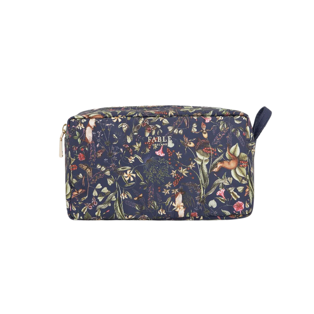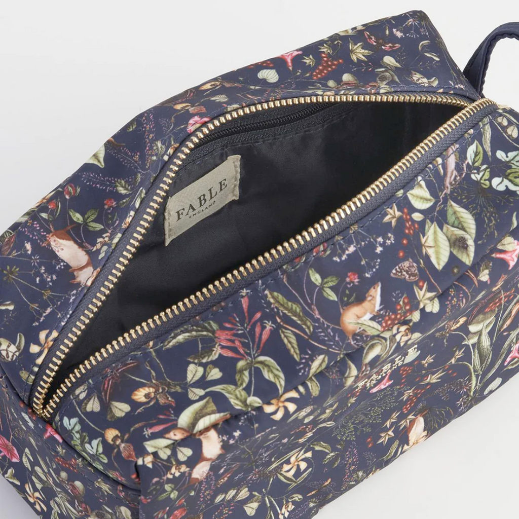 Organize your makeup essentials or toiletries with elegance in this cosmetic pouch by Fable England. The nylon outer fabric features Fable's Wolf Garden print, and the polyester inner lining features a small zippered pocket. Measures approx. 9" x 5.5" x 3.5". Wipe clean with a damp cloth. Print layout will vary from photos. Designed in England.