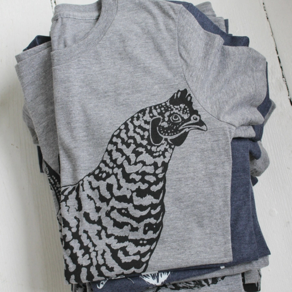 Welcome to the magical world of Hearth and Harrow! Now you can wear your favorite tea towel friends on a T-shirt! This tee features the artist's original chicken design, hand printed using environmentally friendly water-based ink. The T-shirt is 25% organic US cotton, 50% recycled polyester from plastic bottles, and 25% TENCEL Modal organic cotton Slight variations in print are possible. Care instructions: Machine wash cold, tumble dry. Handmade in US.