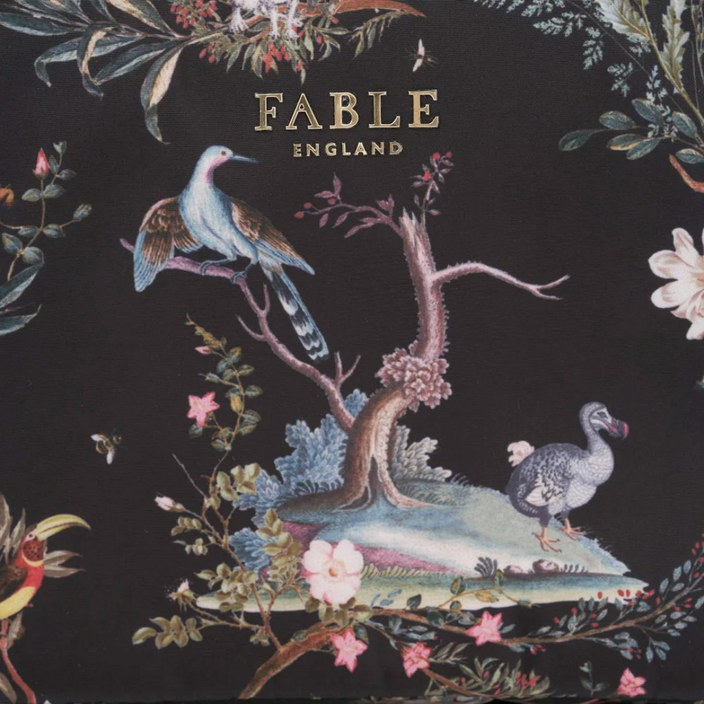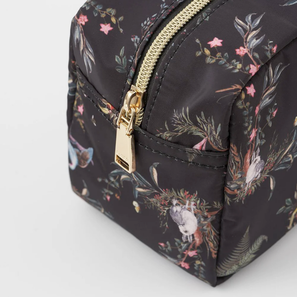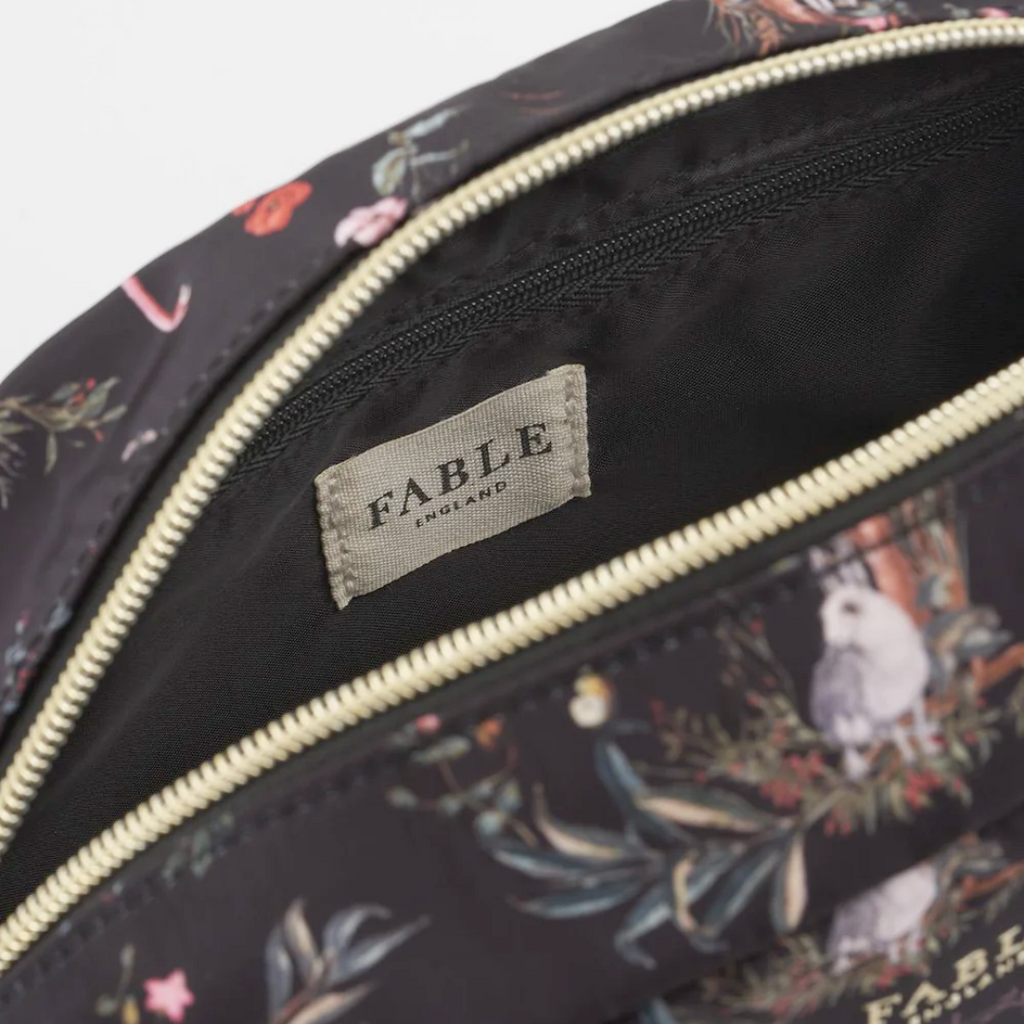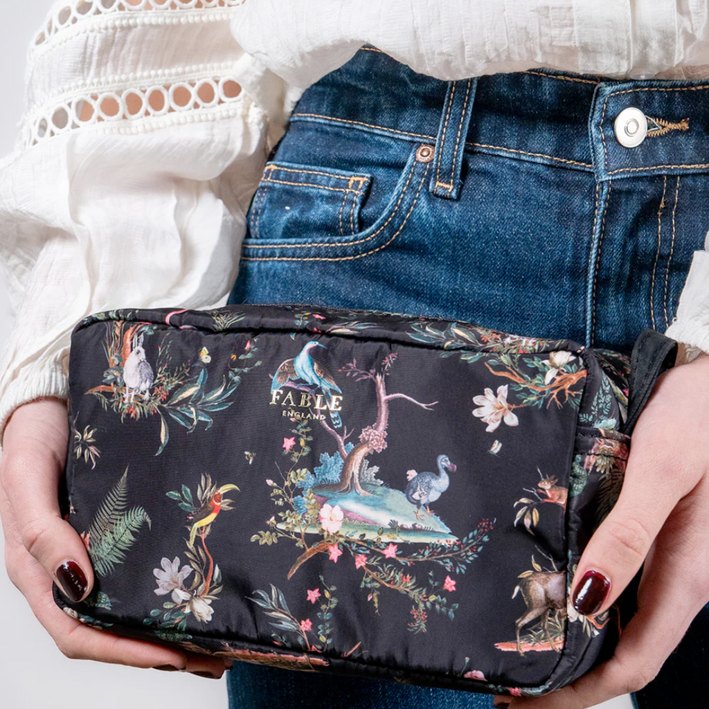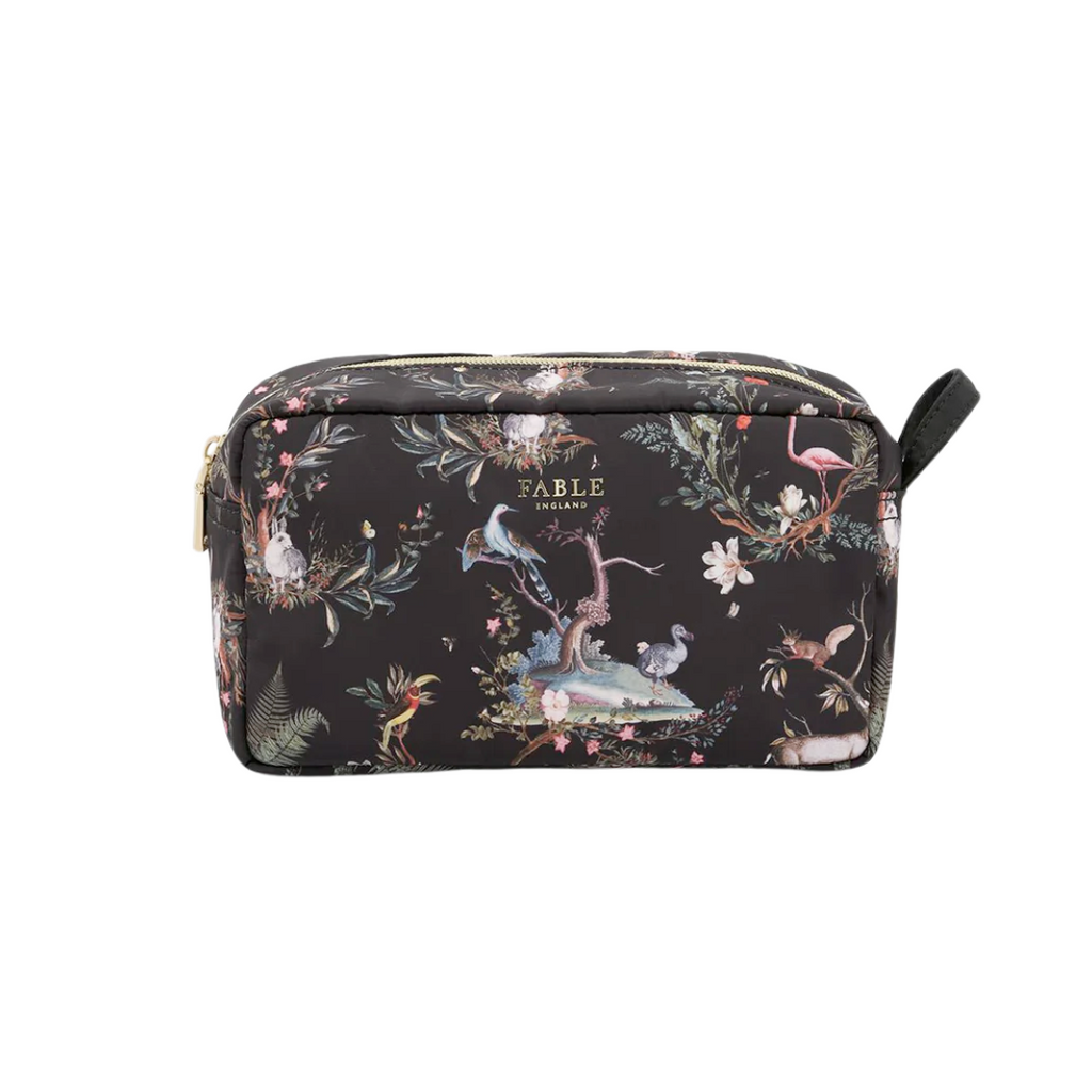 Organize your makeup essentials or toiletries with elegance in this cosmetic pouch by Fable England. The nylon outer fabric features Fable's enchanting "Wonderland" print filled with wonderful birds and creatures in nature, and the polyester inner lining features a small zippered pocket. Measures approx. 9" x 5.5" x 3.5". Wipe clean with a damp cloth. Print layout will vary from photos. Designed in England.
