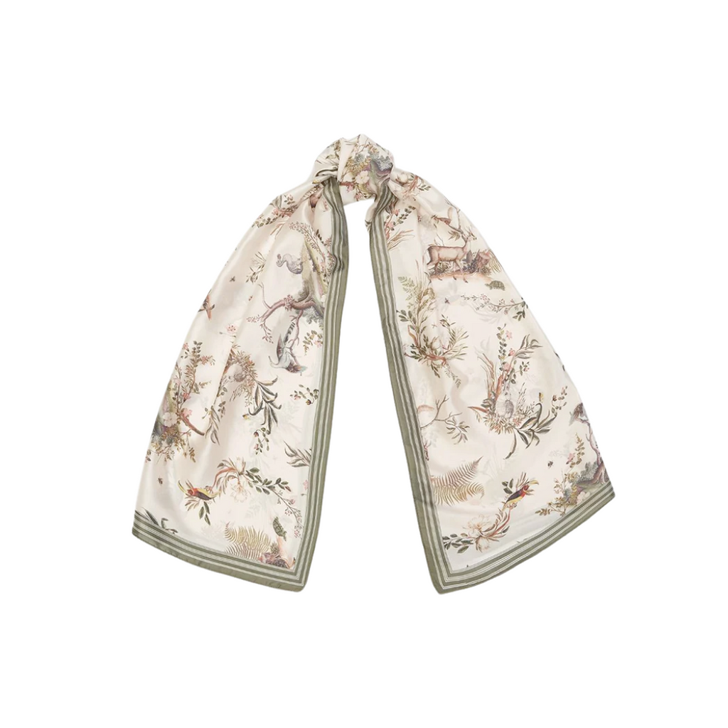 Welcome to the charming world of Fable England! This ultra soft sage and ivory scarf is decorated with Fable's enchanting "Wonderland" scene featuring wonderful birds and creatures in nature! Measures 70" x 24". Made with 100% polyester. Limited Edition. Handwash. Designed in England.