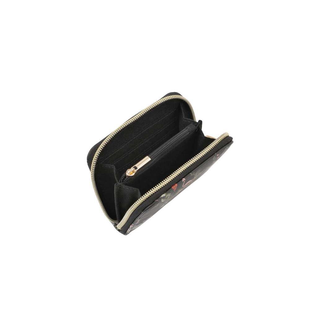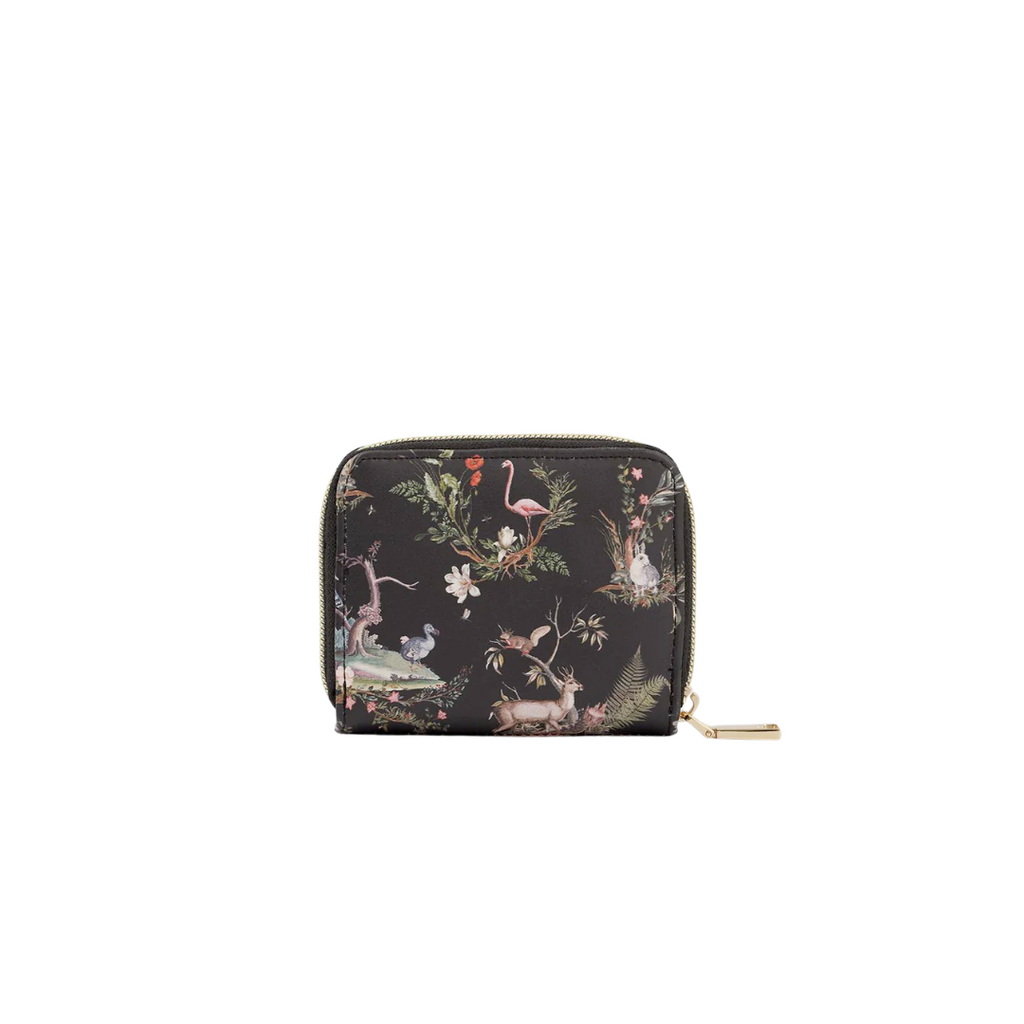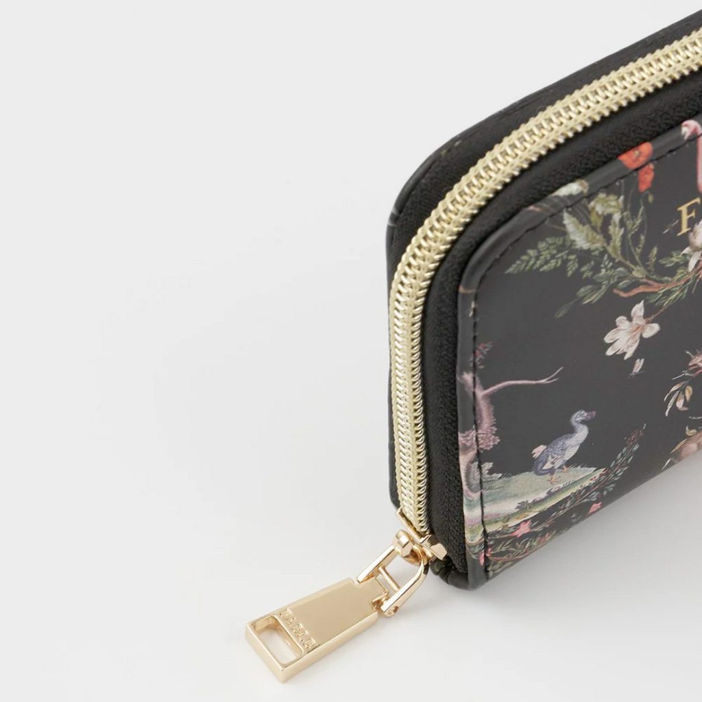 Welcome to the charming world of Fable England! Store your cards and money with easy access in this pretty wallet. The black vegan leather exterior features Fable's "Wonderland" print filled with birds and creatures in nature. The wallet features a black polyester interior with a zipper closure and has three card slots, a zipper pocket, and two compartments. Measures 4.5" long x 3.5" tall x 1" wide. Wipe clean with a damp cloth. Print layout will vary from photos. Designed in England.