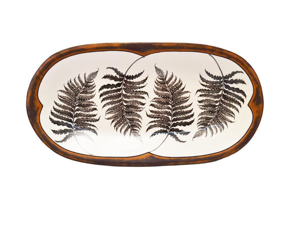 Welcome the charm and serenity that is nature into your home with a beautiful Laura Zindel piece! Both functional and decorative, this serving dish with brown accent color adorns the artist's original illustrations of a wood fern. Made from earthenware and glazed with non-toxic, low-fire glazes. Measures 2” x 16” x 8”. Handcrafted in US. Hand wash only in warm soapy water with a non-abrasive cloth; they should not be placed in the oven, microwave, or dishwasher and should be used only as serving dishes. Avoid storing for long periods of time in direct sunlight.