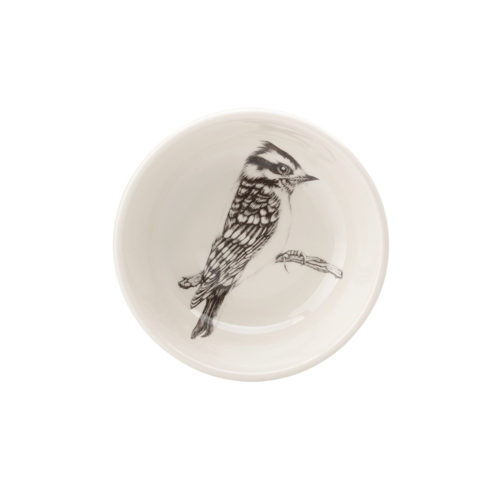 Welcome to the charm and serenity that is nature into your home with a beautiful Laura Zindel piece! Both functional and decorative, this bowl adorns the artist's original illustration of an owl. Made from high-resistance white china. Measures 5.5" wide and 2" deep. Microwave and dishwasher safe. Handcrafted in US.