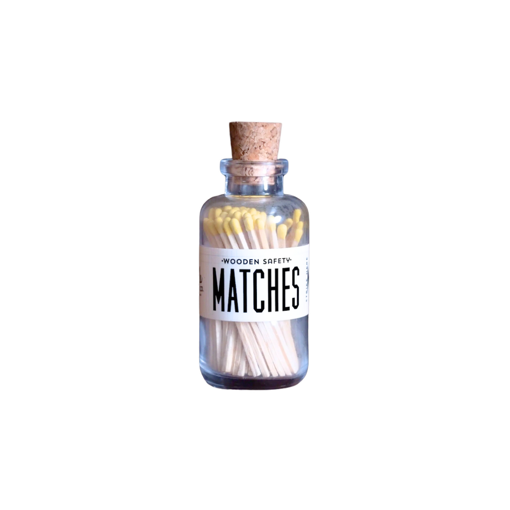 Enjoy adding a pop of color and functionality to your home with Made Market Co. yellow tip wooden matches, displayed in a vintage style apothecary bottle with striker strip on the side. Each bottle contains 45 matches and is tightly sealed with a cork stopper. Bottle measures 4 inches tall.