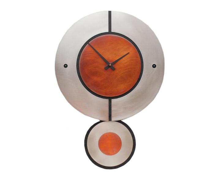 Combining the simplicity of line with the complexity of color, this clock by Leonie Lacouette has a modern look with a rustic edge. Made of steel, copper and wood. Clock mechanism runs on AA batteries. Batteries not included. Measures approximately 26 x 18 x 2 in. Handcrafted in the US.