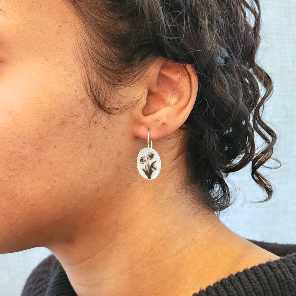 With her antique-inspired palate, Anzu Jewelry evokes a sense of the nostalgic past with her elegant, illustrated motifs. These earrings feature the artist's hand drawing of daffodils on special plastic that she uses as her canvas. Made with sterling silver, the earrings measure 0.43” wide and 1.12” long from the top of the earwires. Because each piece is hand drawn and forged by the artist, each piece is truly unique and will show variations. Handmade in Stuttgart, Germany.