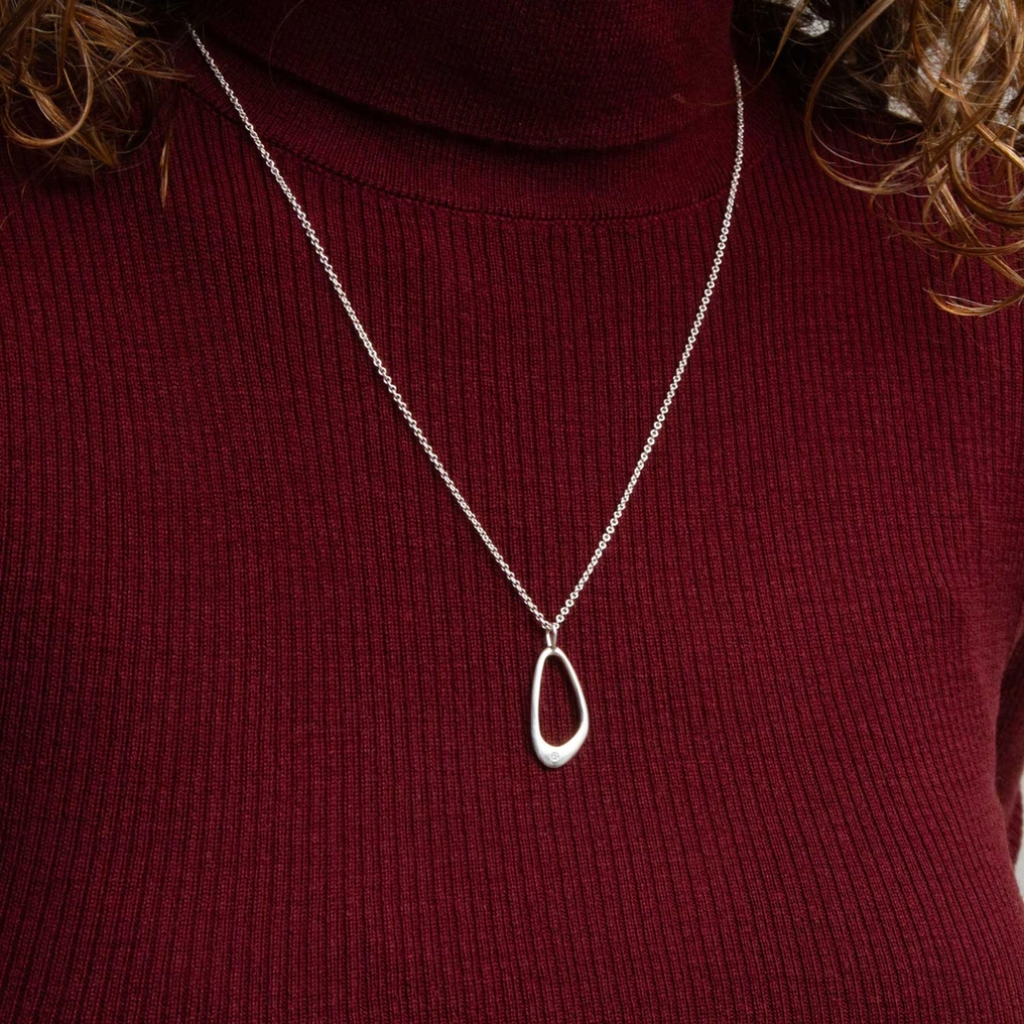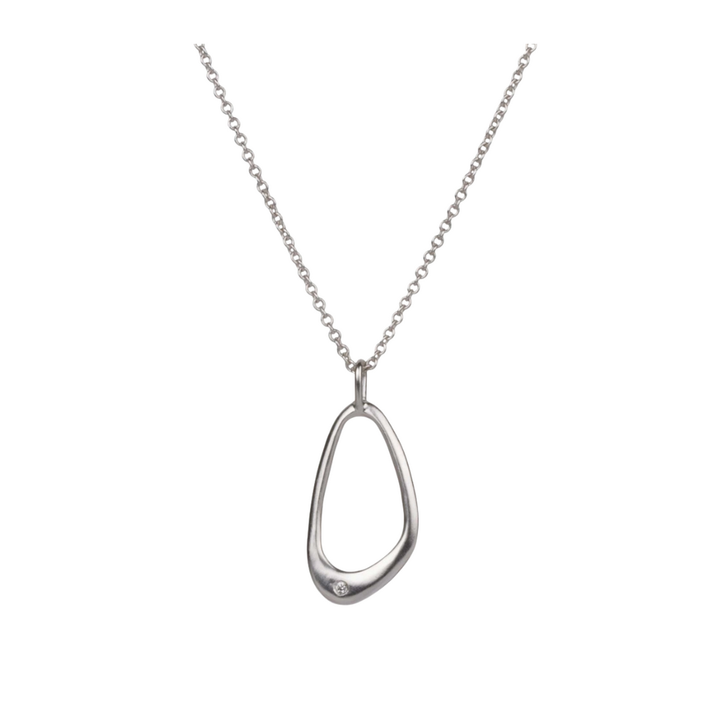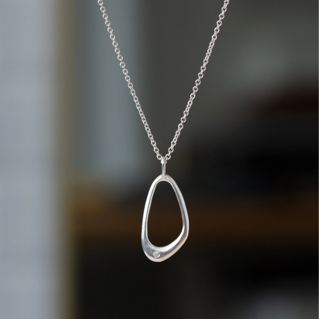 This charming Wake diamond pendant by Corey Egan is perfect for everyday wear. The organic shaped pendant set with a little diamond is the perfect addition to your jewelry box! Made of sterling silver, the necklace can be worn at 20 inches or 22 inches with a hook closure. The recycled diamond is 0.015ct GH SI. The pendant measures 1.25 inches long and 0.56 inches wide. Handcrafted in US.