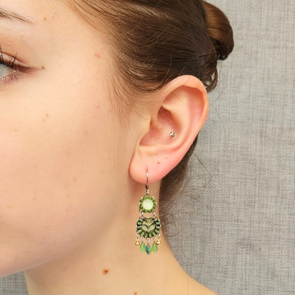 Fun and striking, Ayala Bar jewelry is full of whimsy and perfect for everyday wear or for dressing up. Made with silver plated brass & metal alloys (nickel & lead free), glass beads, ceramic stones, crystal rhinestones, and patterned paper or fabrics. These leverback earrings measure 0.63" at the widest point and 1.94" long. Handmade in Israel.
