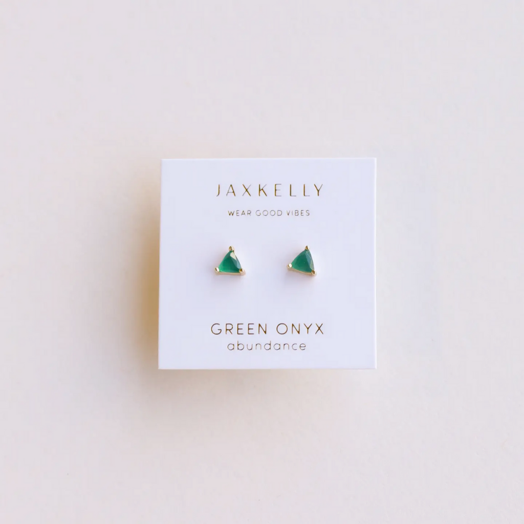 The mini energy gemstone studs by JaxKelly are just what you need to add a little color to your ears. Perfect for everyday, these triangular-shaped green onyx are set in a four prong setting of 18ky gold plate over sterling silver. Stone measures approximately 0.3". Handcrafted in US.
