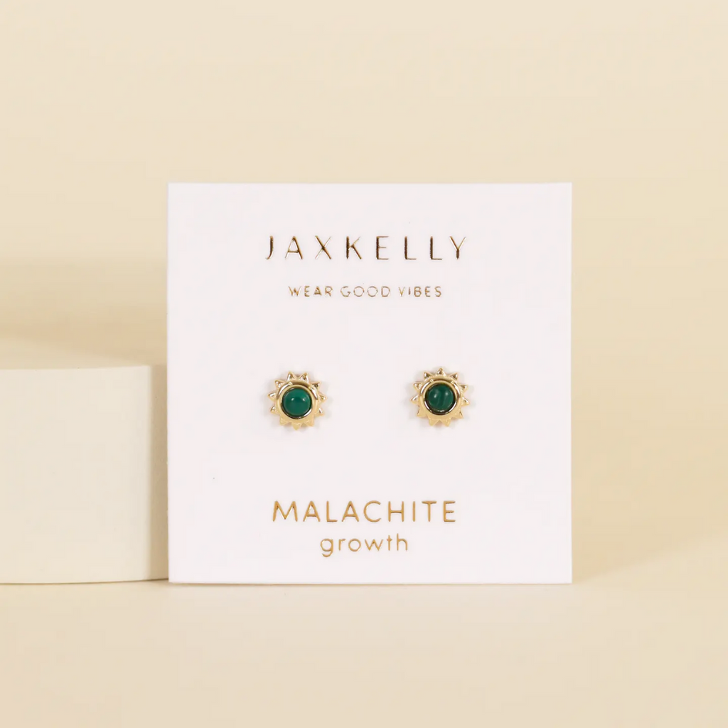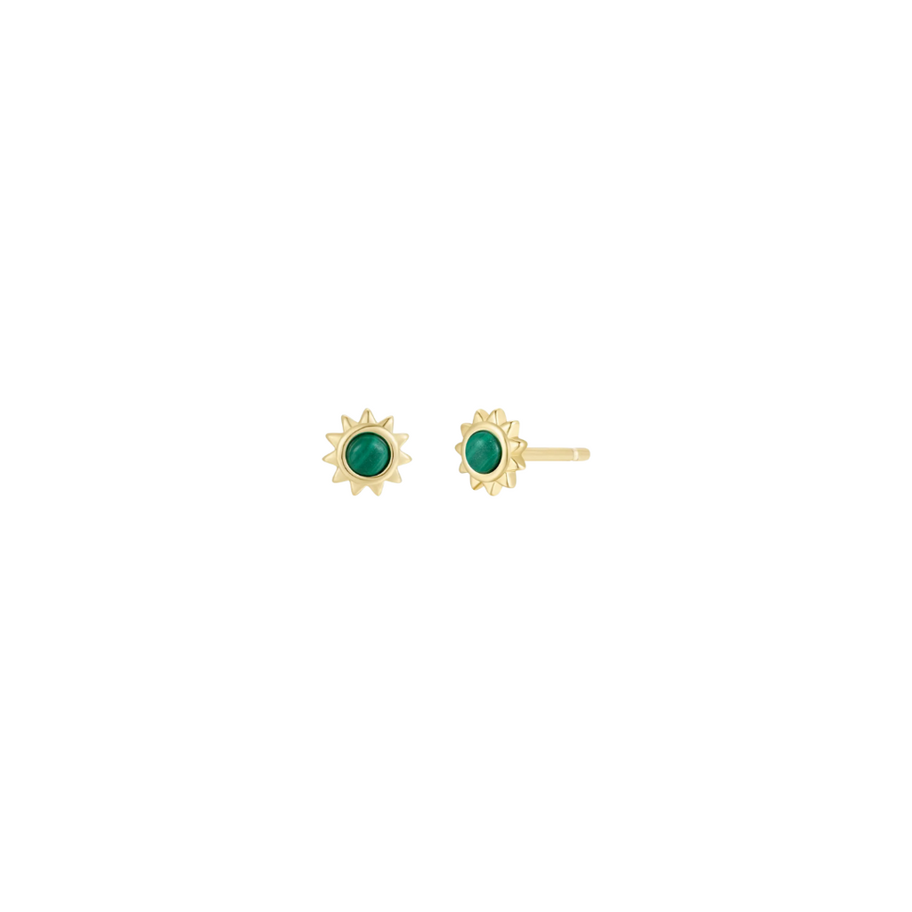 These sun studs by JaxKelly are perfect for everyday wear! The polished malachite cabochons are set in a sun-like bezel for a sweet, delicate look. Wear alone or in a stack. Made from 18k yellow gold plate over sterling silver. The earrings measure 0.18" in diameter. Handmade in US.