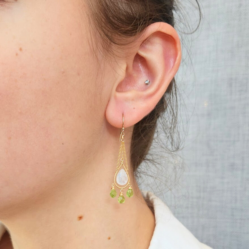 Elegant handcrafted wire wrapping meets colorful gemstones in Lina Tsui jewelry. These earrings are made of 14k yellow gold fill wire, a teadrop moonstone and peridot briolettes, and gold filled ear wires. Measure approximately 2" long x 0.44" wide. Handcrafted in US.