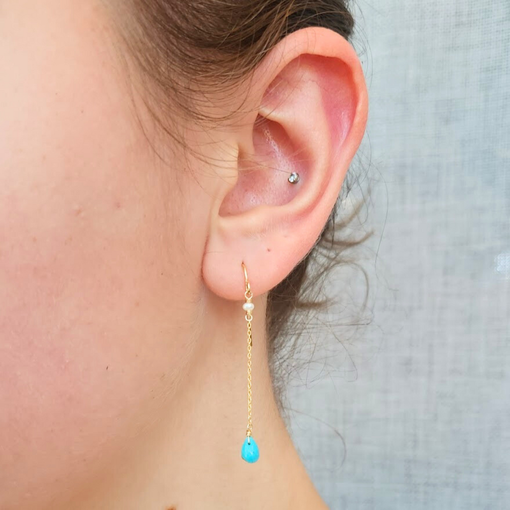 Elegant handcrafted wire wrapping meets colorful gemstones in Lina Tsui jewelry. These earrings are made of 14k yellow gold fill wire, turquoise and pearl beads, and gold filled ear wires. Measure approximately 1.75" long x 0.19" wide. Handcrafted in US.