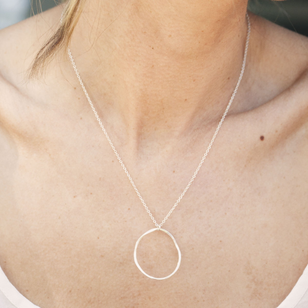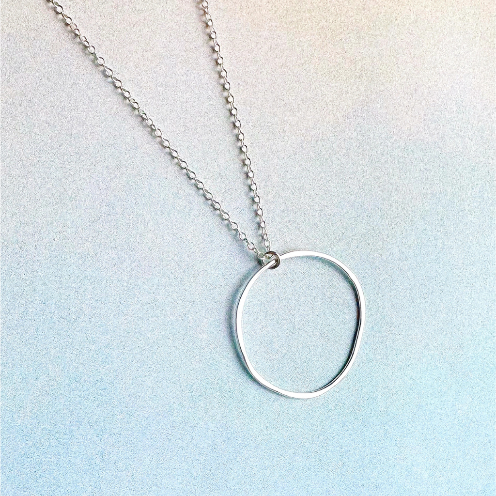 Minimalism at its best, this Orbita necklace by Freshie & Zero is light, sexy, and great for everyday wear! An organically shaped circle in sterling silver is suspended on a 16" sterling silver chain. The pendant measures approximately 1" in diameter. Handmade in US.