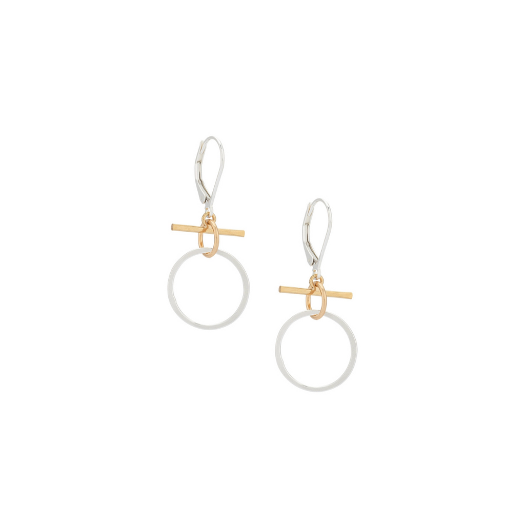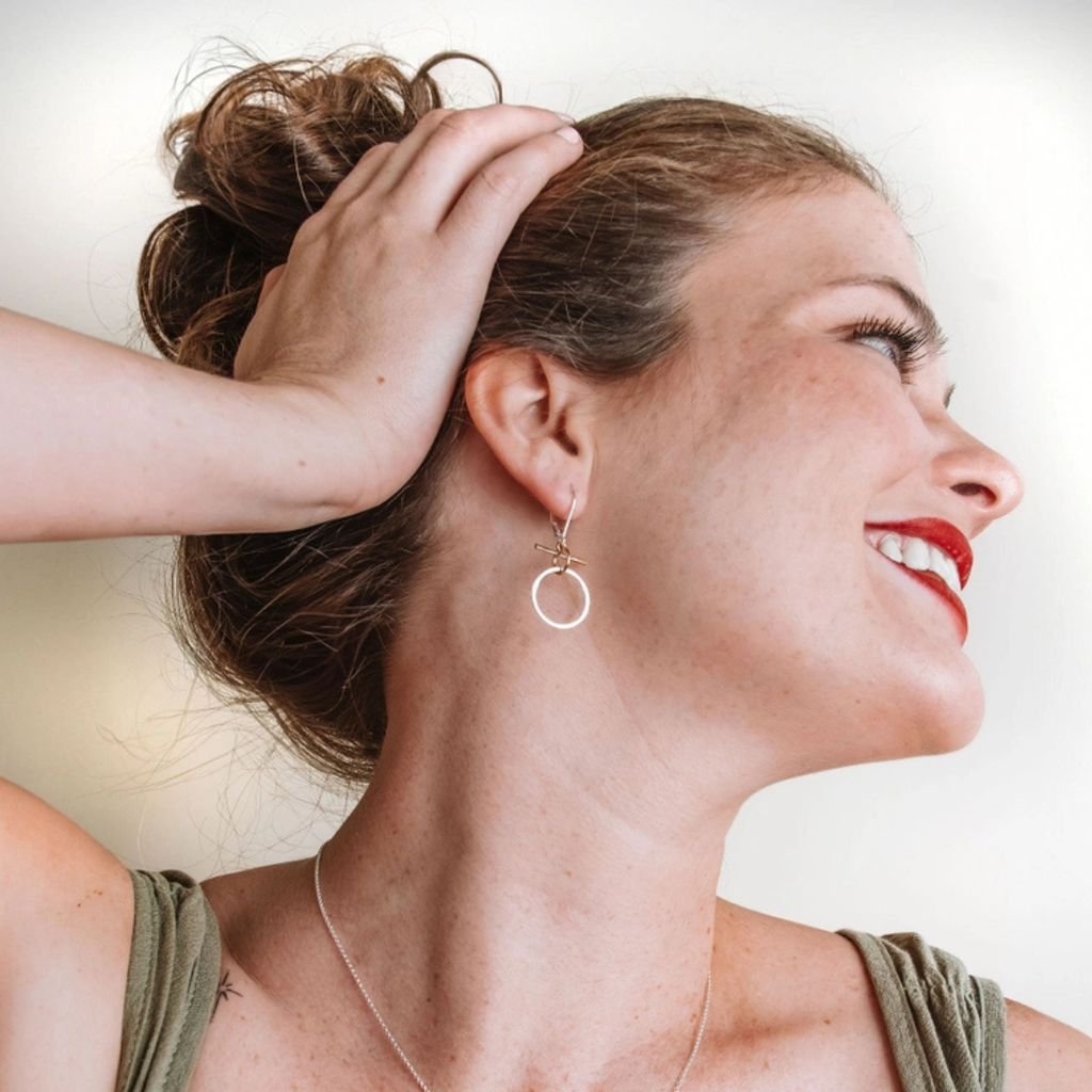 Minimalism at its best, these pixie hammered earrings by Freshie & Zero are light, sexy, and great for everyday wear! A sterling silver not-so-perfect hammered circle is suspended under a gold filled bar, and hangs from sterling silver lever back ear wires. These earrings measure approximately 0.68" in diameter and measure 1.5" from the top of the ear wire to the bottom of the circle. Handmade in US.
