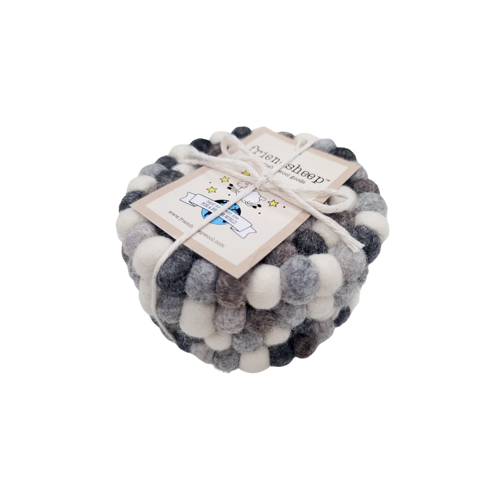 Friendsheep coasters are a great gift for loved ones or for your own home! Each set of 4 coasters is handmade using ethically and sustainably sourced wool felt, therefore each set will look slightly different in shape and color. Aprroximate measurements of one individual coaster is 4 inches in diameter x 0.5 inches thick.