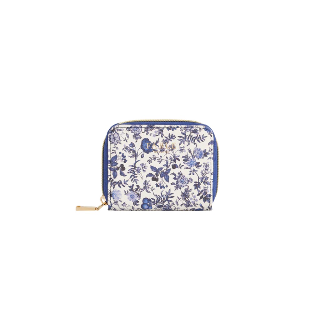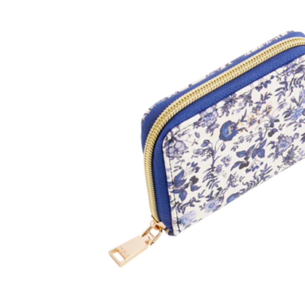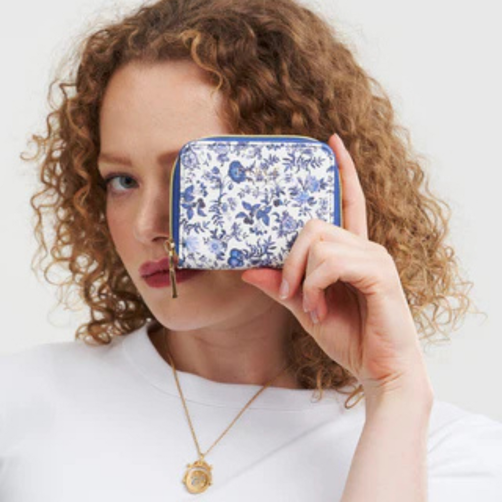 Store your cards with easy access in this wallet by Fable England! The vegan leather exterior features Fable's Ditsy Blue print and features a navy blue interior with six card slots, a polyester lined zipper pocket for change, and two compartments for cash, receipts, or checks. Measures 4.5" long x 4" tall x 1" wide. Wipe clean with a damp cloth. Print layout will vary from photos. Designed in England.