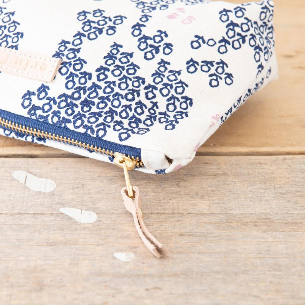 Be bold, colorful, and bring happiness to your everyday life with one of Erin Flett's fun accessories! Created from the artist's hand-drawn graphics that is screen printed, this cute bag is perfect for holding your essentials! Use it as a clutch or for traveling. Made with cotton barkcloth, cotton canvas lining, brass hardware, and leather detailing. Measures 9" x 7"x 2" gusset. Machine wash cold and dry flat. Handmade in US.
