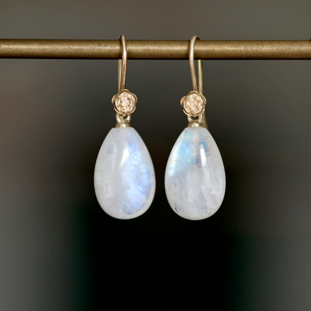 Cherish nature's beautiful offerings with Hannah Blount Jewelry! Her simple, sophisticated aesthetic charms its way through her nature-inspired designs. Inspired by the Parisian rose garden, the Roseraie de L'Haÿ, these earrings feature Hannah's hand-formed sculptural roses with smooth moonstone drops. These limited edition earrings are made of 14k yellow gold and measure 1" tall including the ear wire, and 0.33" at the widest. Handcrafted in US.