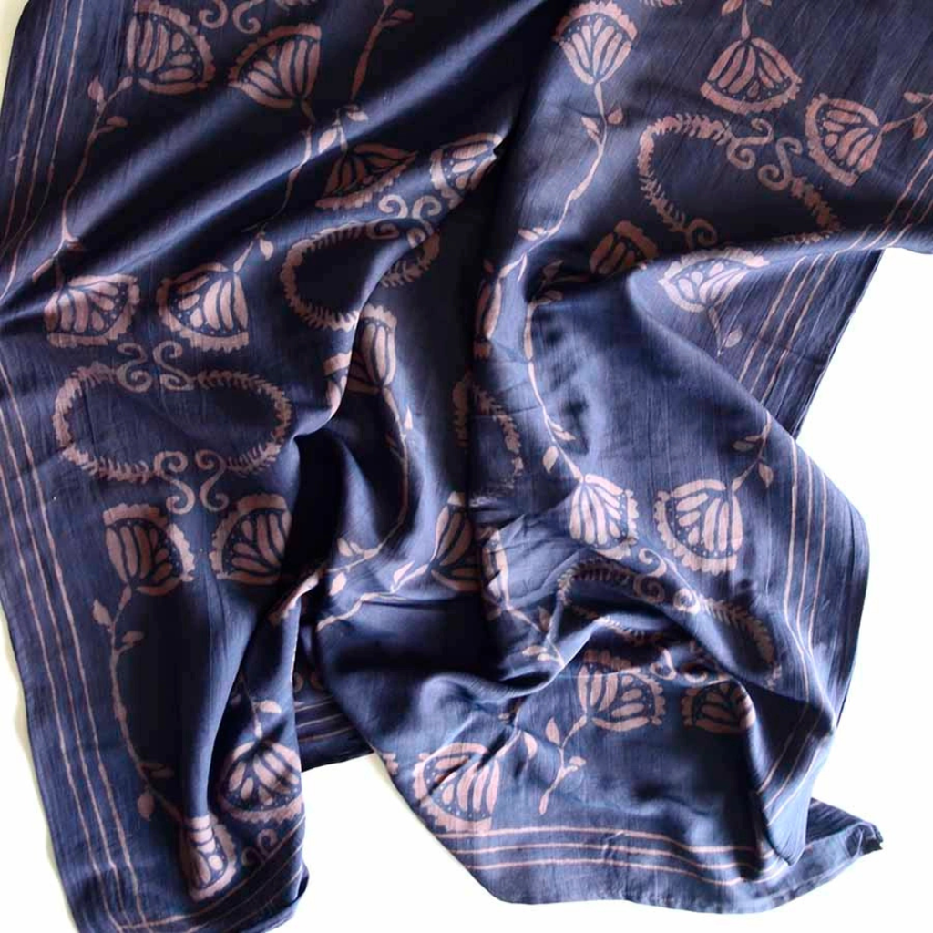 This beautiul purple scarf by ichcha is inspired by classic Danish floral patterns. The scarf is dyed naturally and hand block printed using carved wooden blocks. Made of 25% silk and 75% cotton, the scarf is soft to the touch and great for everyday wear and on special occasions! Measures 34" x 78". Sizes may vary 1-2 inches and there will be some color variance due to the handmade nature of the piece.