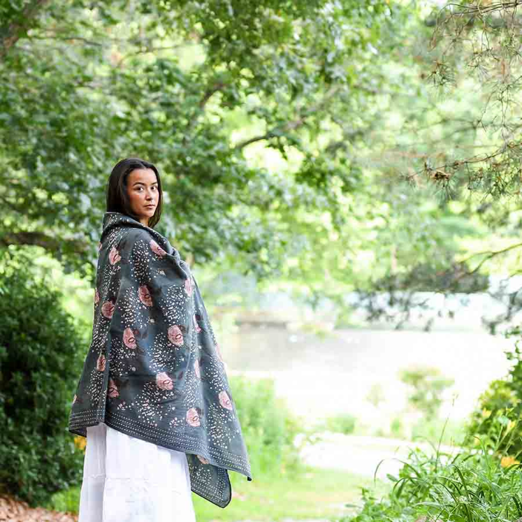 Adorned with blush pink florals and soft speckled details, this forest green scarf by Ichcha is dyed naturally and hand block printed using carved wooden blocks and an iron and mud resist techniques. Made of 25% silk and 75% cotton, the Komal scarf is soft to the touch and great for everyday wear and on special occasions! Measures 34" x 78". Sizes may vary 1-2 inches and there will be some color variance due to the handmade nature of the piece. CARE: hand or machine wash on cold gentle cycle. Lay flat to dry. Iron if necessary.