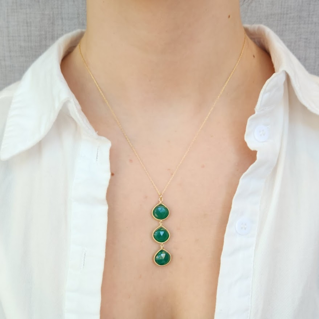 Elegant handcrafted wire wrapping meets colorful gemstones in Lina Tsui jewelry. This necklace is made of 14k yellow gold fill wire, teadrop rose cut green onyx, and a gold filled adjustable 16-18" chain. The gemstone pendant measures approximately 2" x 0.5". Handcrafted in US.