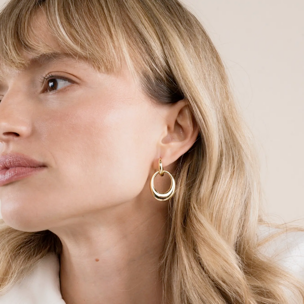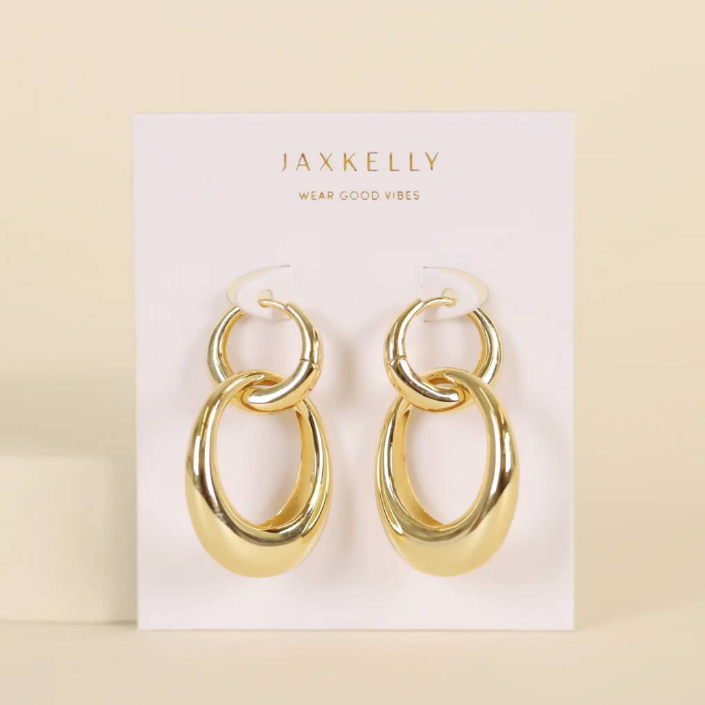 Two circles are coupled together in these JaxKelly hoops for a unique look! Made of 18ky gold plate over brass (with 18ky gold plate over sterling silver posts), these earrings measure 1.5" long and 0.5" at the widest. What's more, you take the larger circle off to wear the smaller huggies alone. With a curved post and snap closure. Tarnish free and hypoallergenic. Handmade in US.