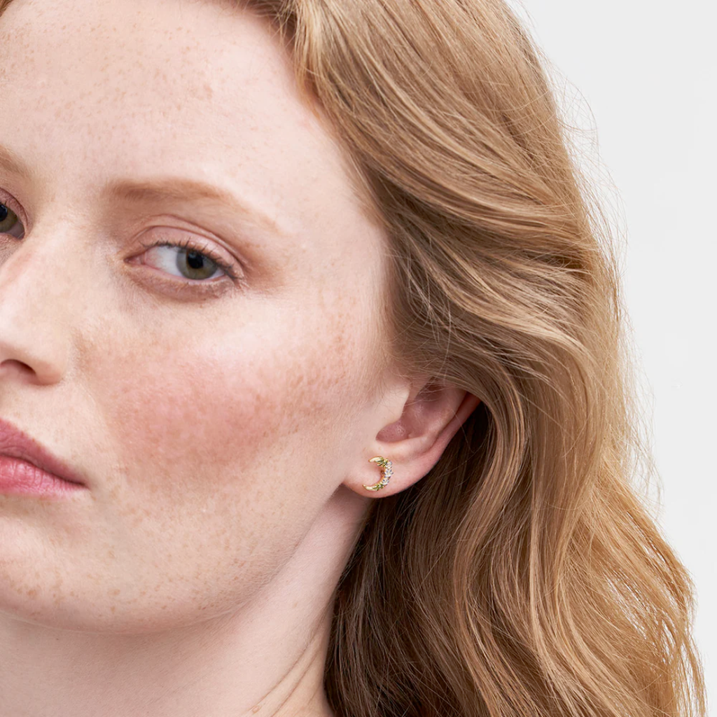 Welcome to the charming world of Fable England! These beautiful delicate stud earrings from Fable's Nightshade collection captures the quiet mystery of the nightshade flower. The flower is hand painted in enamel over a gold crescent moon. Crafted from 22kt gold-plated over brass and zinc alloy, the earrings measure 0.25" diameter. Designed in England.