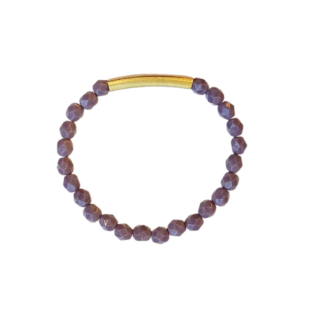 Add a pop of color and joy to your daily jewelry ensemble with this Purple Bead Bracelet by Nest Pretty Things. The stretch cord bracelet is made of 6mm czech glass beads & a 1.5" long brass bead. Measures 7". Handcrafted in US.