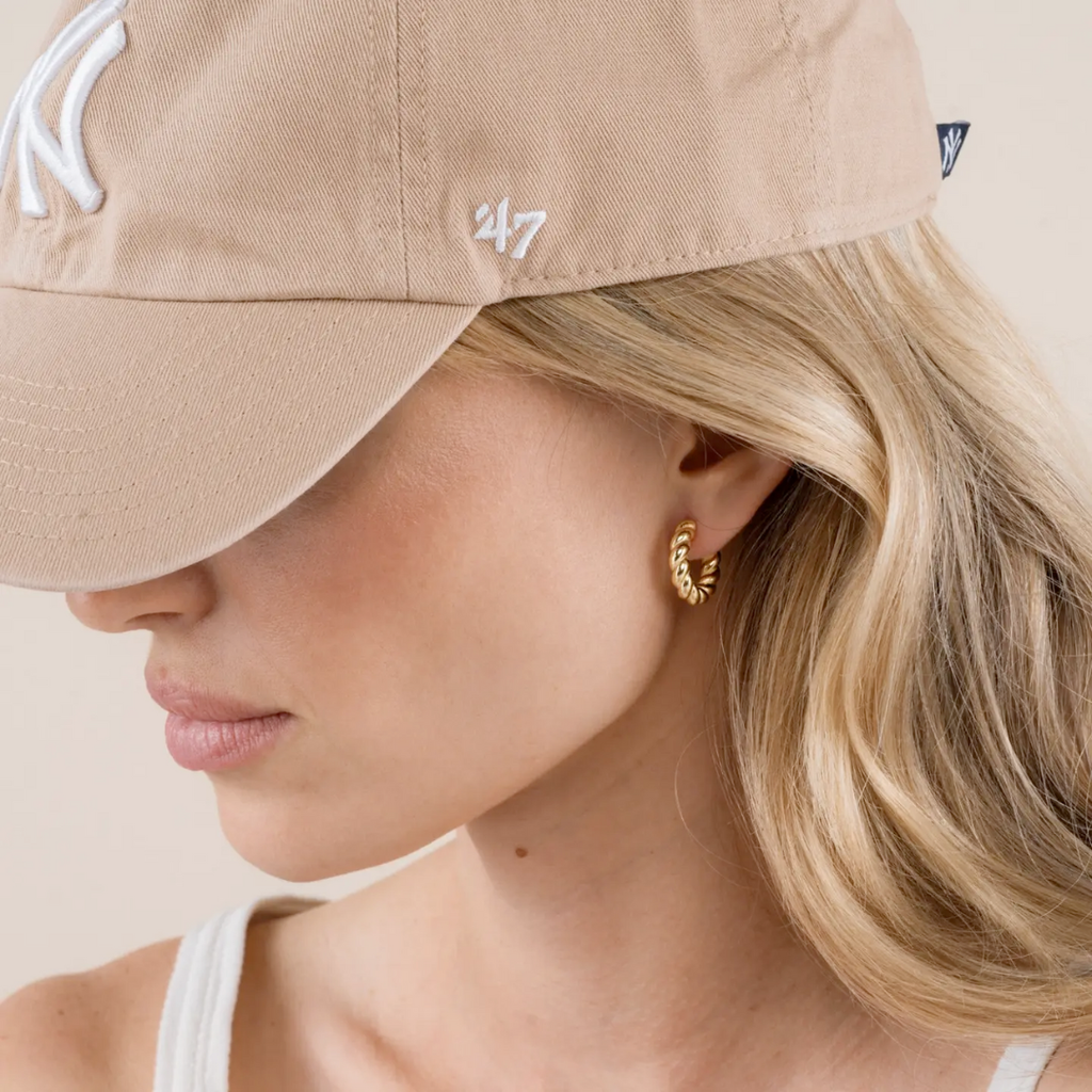 Your classic everyday hoops with a twist by JaxKelly! Made of 18ky gold plate over brass (with 18ky gold plate over sterling silver posts), these huggies measure 0.5 in diameter. With a curved post and snap closure. Tarnish free and hypoallergenic. Handmade in US.