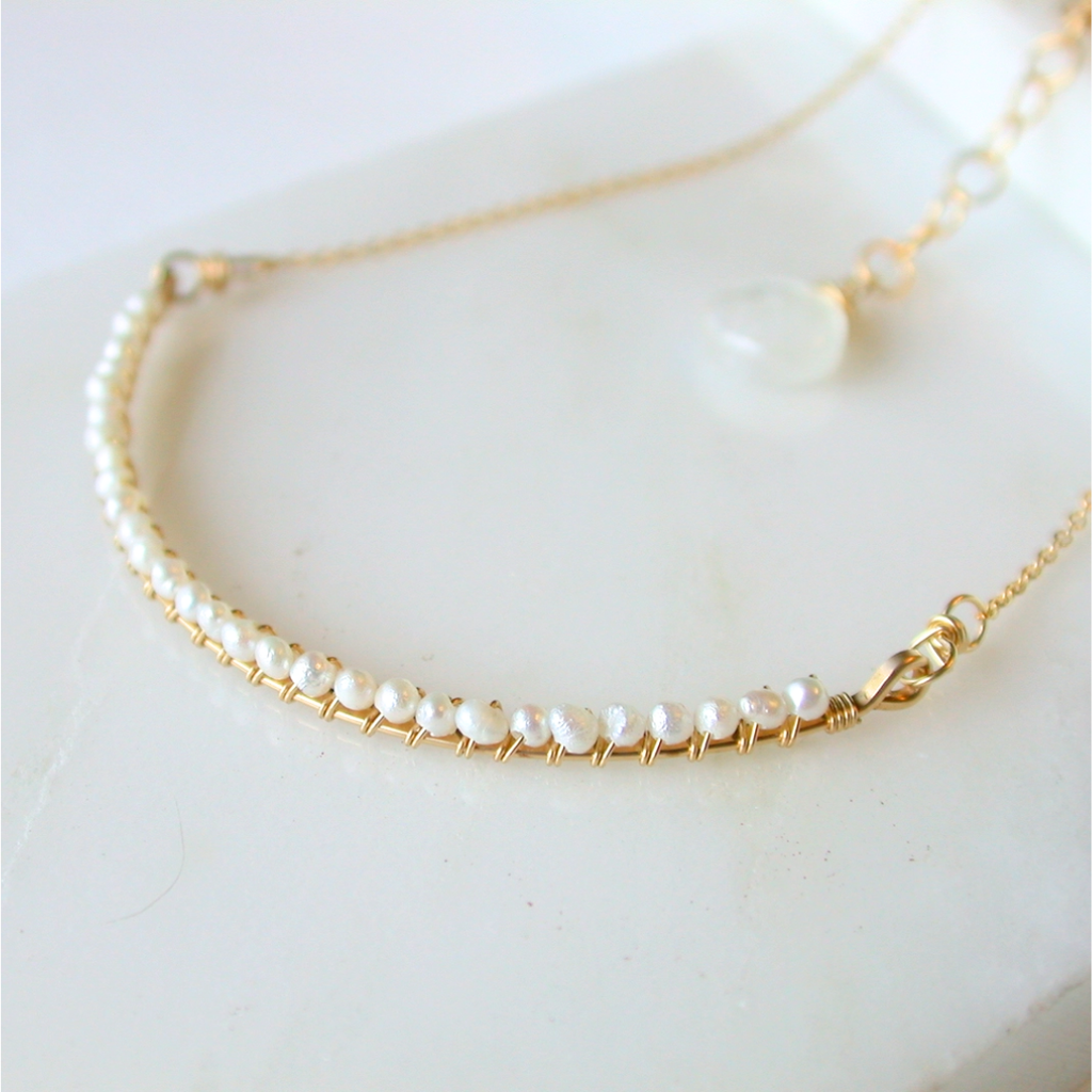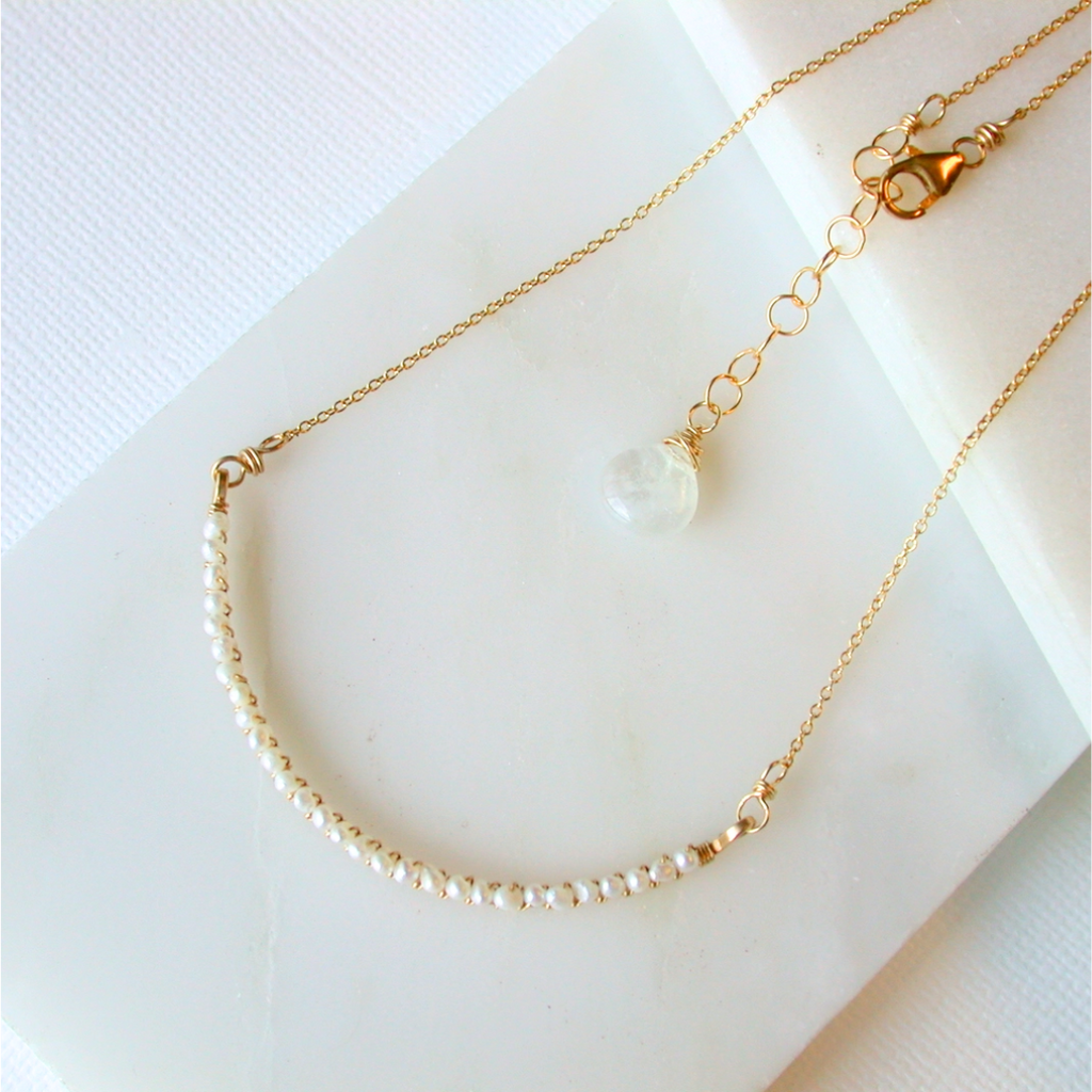 You'll love the simplistic beauty of this Linda Trent Jewelry necklace! This handcrafted, lightweight necklace is made of gold-fill and pearl beads. The curved bar measures approximately 2" across, and the necklace length is adjustable from 16-17". Handcrafted in US.