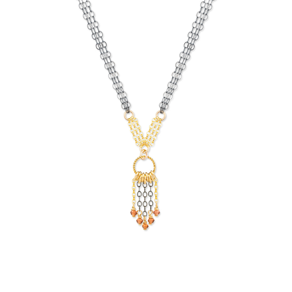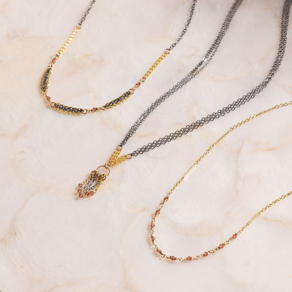 Defined by modern elegance, Kate Winternitz creates delicate, thoughtful jewelry to showcase her love of detail and composition. The Maizie Necklace features a petite braided circle with cascading silhouette of chains with faceted garnets on its ends. Made from 14kt gold fill and oxidized silver, the pendant measures 1" long and 0.31" wide. The chain can be worn between 16.5-18". Handmade in US.