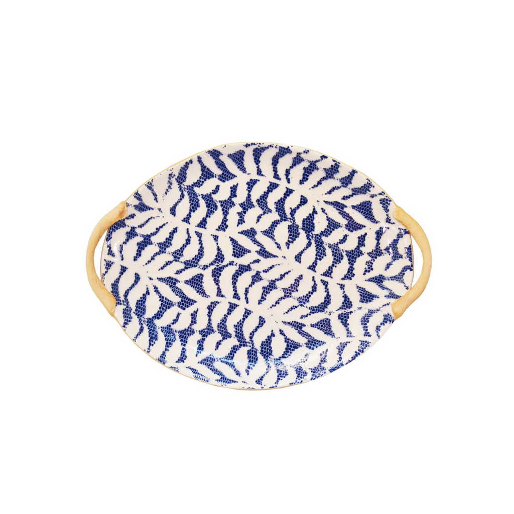 Alive with color and texture, this ceramic tray by Terrafirma is functional as it is beautiful. Using fabric and lace as a stencil to create the fern pattern in cobalt color, the tray is ideal for every day use. With bold patterns and colors, mix and match with other dinnerware for a unique table setting! Dishwasher safe. Measures approximately 12.5” x 9.25”. Made in the US.
