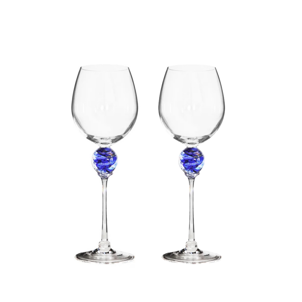 Add unique color and charm to your table with these handblown wine glasses by Romeo Glass! The blue and iridescent planet on the stem of the glass make this glassware a fun and beautiful choice for everyday use or special occasions. Makes a wonderful wedding gift. Sold by the pair. Measures approx. 9.75” tall. Handcrafted in US.