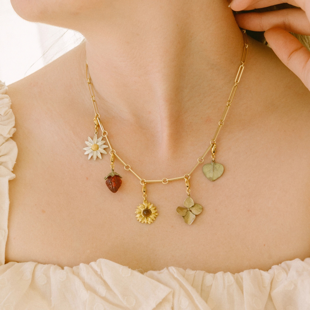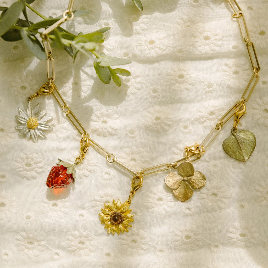 Behold nature and all its beauty with this Strawberry Charm by Silver Seasons. Made by creating molds directly from botanical elements, artist Michael Michaud effortlessly captures both the beauty and details of the actual flora. Made with cast bronze with a soft green patina and cast glass to make the strawberry. The charm is approximately 0.5" wide and 1.25" long with a gold filled lobster claw clasp to hang the charm on a bracelet or chain. Handmade in US.