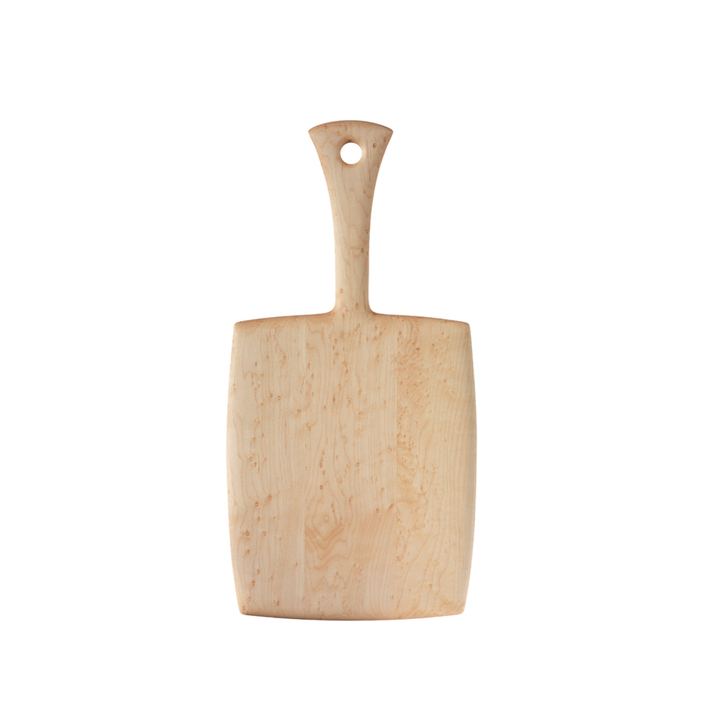 This cutting board by Edward Wohl is an art object that is designed to add aesthetic and utilitarian pleasure to your daily life. Made of solid bird's-eye maple, this board has graceful edges and a liquid-smooth finish. Measures 7.75 x 15.5 inches. Handcrafted in US. Woodgrain pattern will vary.