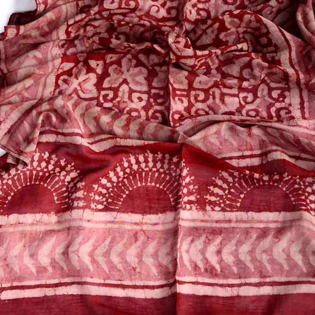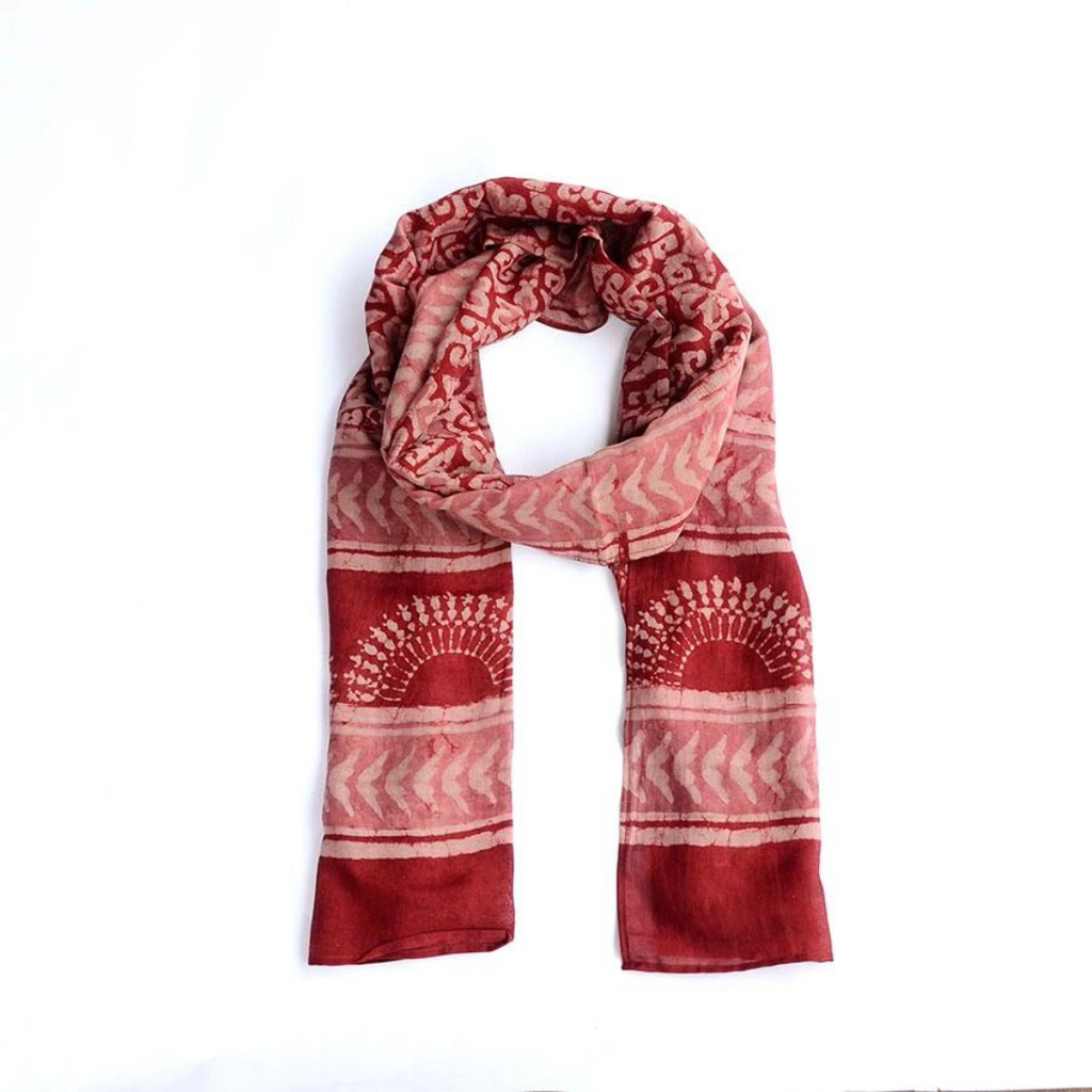 This beautiful red colored geometric scarf by Ichcha is dyed naturally and hand block printed using carved wooden blocks. Made of 25% silk and 75% cotton, this scarf is soft to the touch and great for everyday wear and on special occasions! Measures 22" x 78". Sizes may vary 1-2 inches and there will be some color variance due to the handmade nature of the piece.