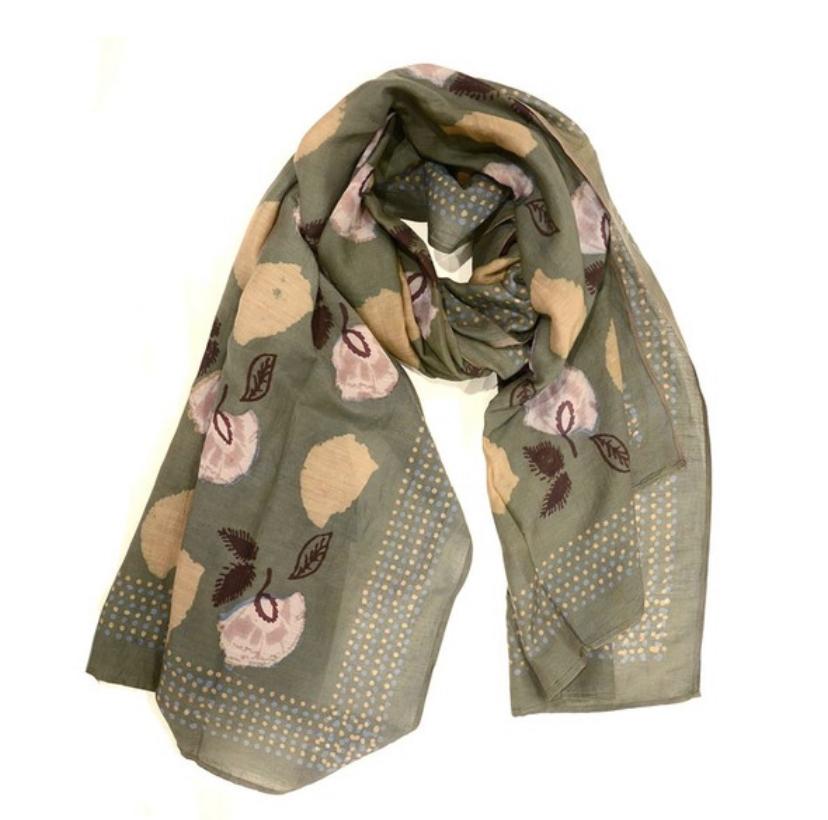 This beautiful green floral scarf by Ichcha is dyed naturally and hand block printed using carved wooden blocks. Made of 25% silk and 75% cotton, the Badra scarf is soft to the touch and great for everyday wear and on special occasions! Measures 36" x 78". Sizes may vary 1-2 inches and there will be some color variance due to the handmade nature of the piece.