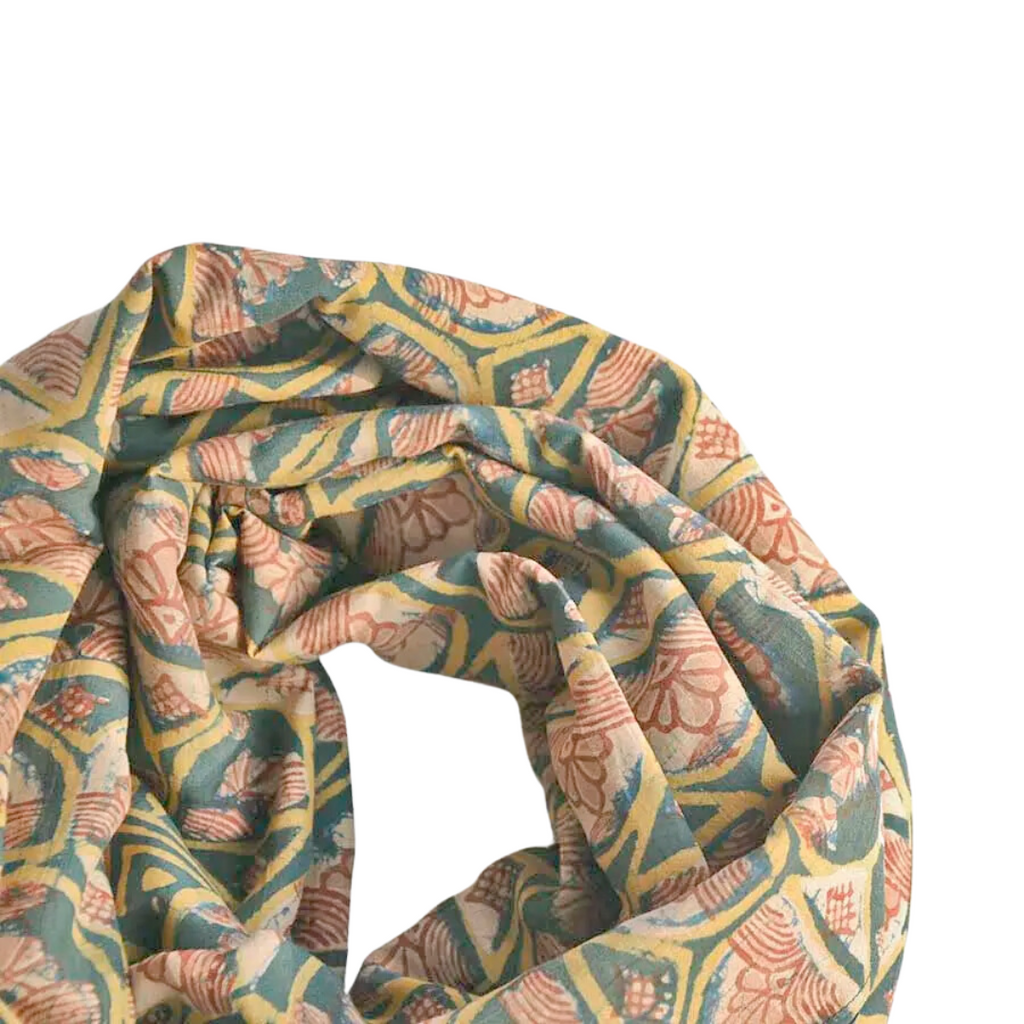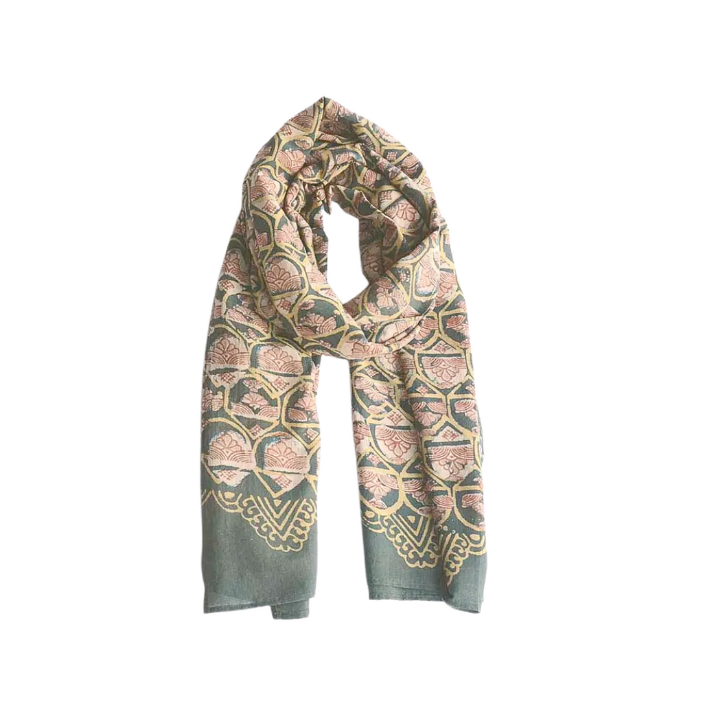 Inspired by small windows that were carved in walls for the breeze to come in and out, this green scarf by Ichcha is dyed naturally and hand block printed using carved wooden blocks and the mud resist technique of Dabu. Made of 25% silk and 75% cotton, the Emerald scarf is soft to the touch and great for everyday wear and on special occasions! Measures 34" x 78". Sizes may vary 1-2 inches and there will be some color variance due to the handmade nature of the piece.