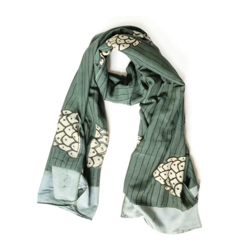 Inspired by artistic doors, this beautiful green scarf by Ichcha is dyed naturally and hand block printed using carved wooden blocks. Made of 25% silk and 75% cotton, the Green Mountain scarf is soft to the touch and great for everyday wear and on special occasions! Measures 36" x 78". Sizes may vary 1-2 inches and there will be some color variance due to the handmade nature of the piece.