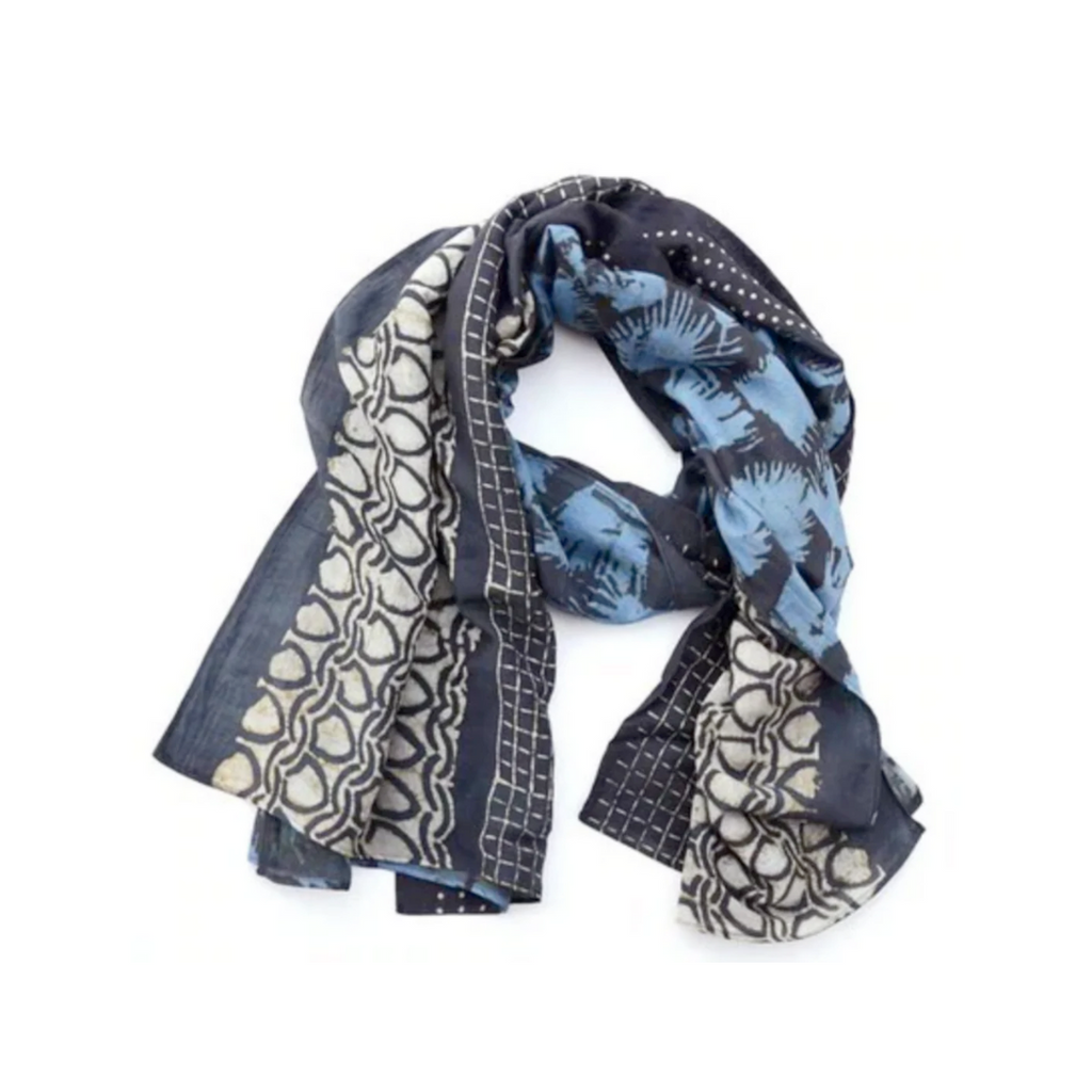 This beautiful black, white, and blue scarf by Ichcha is dyed naturally and hand block printed using carved wooden blocks. Made of 25% silk and 75% cotton, the Hari scarf is soft to the touch and great for everyday wear and on special occasions! Measures 36" x 78". Sizes may vary 1-2 inches and there will be some color variance due to the handmade nature of the piece.
