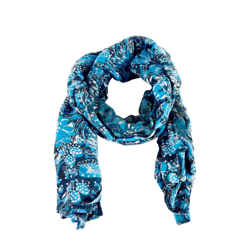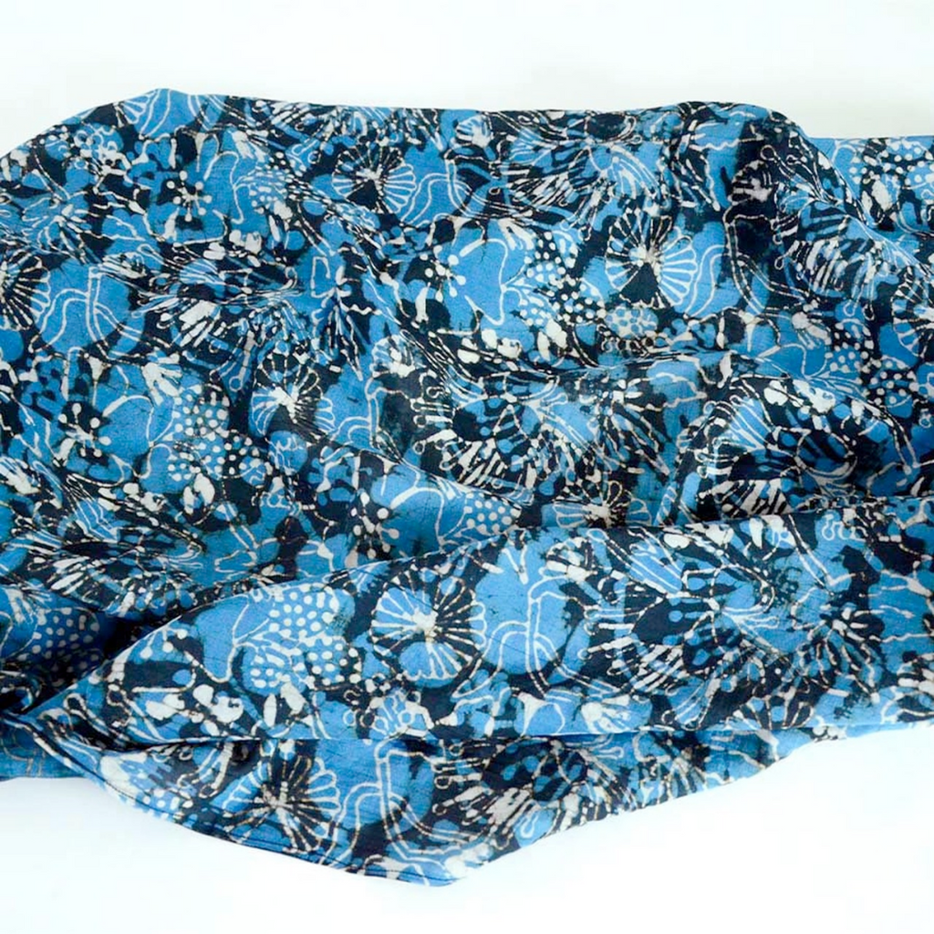 This beautiful blue, black, and white floral scarf by Ichcha is dyed naturally and hand block printed using carved wooden blocks. Made of 25% silk and 75% cotton, the Hope scarf is soft to the touch and great for everyday wear and on special occasions! Measures 34" x 78". Sizes may vary 1-2 inches and there will be some color variance due to the handmade nature of the piece.